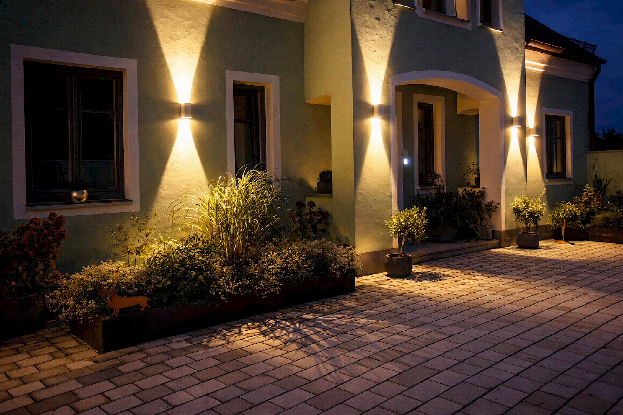 Eine hochwertige Gartenbeleuchtung ergänzt die Architektur des Hauses und steigert die Attraktivität der gesamten Außenanlage.