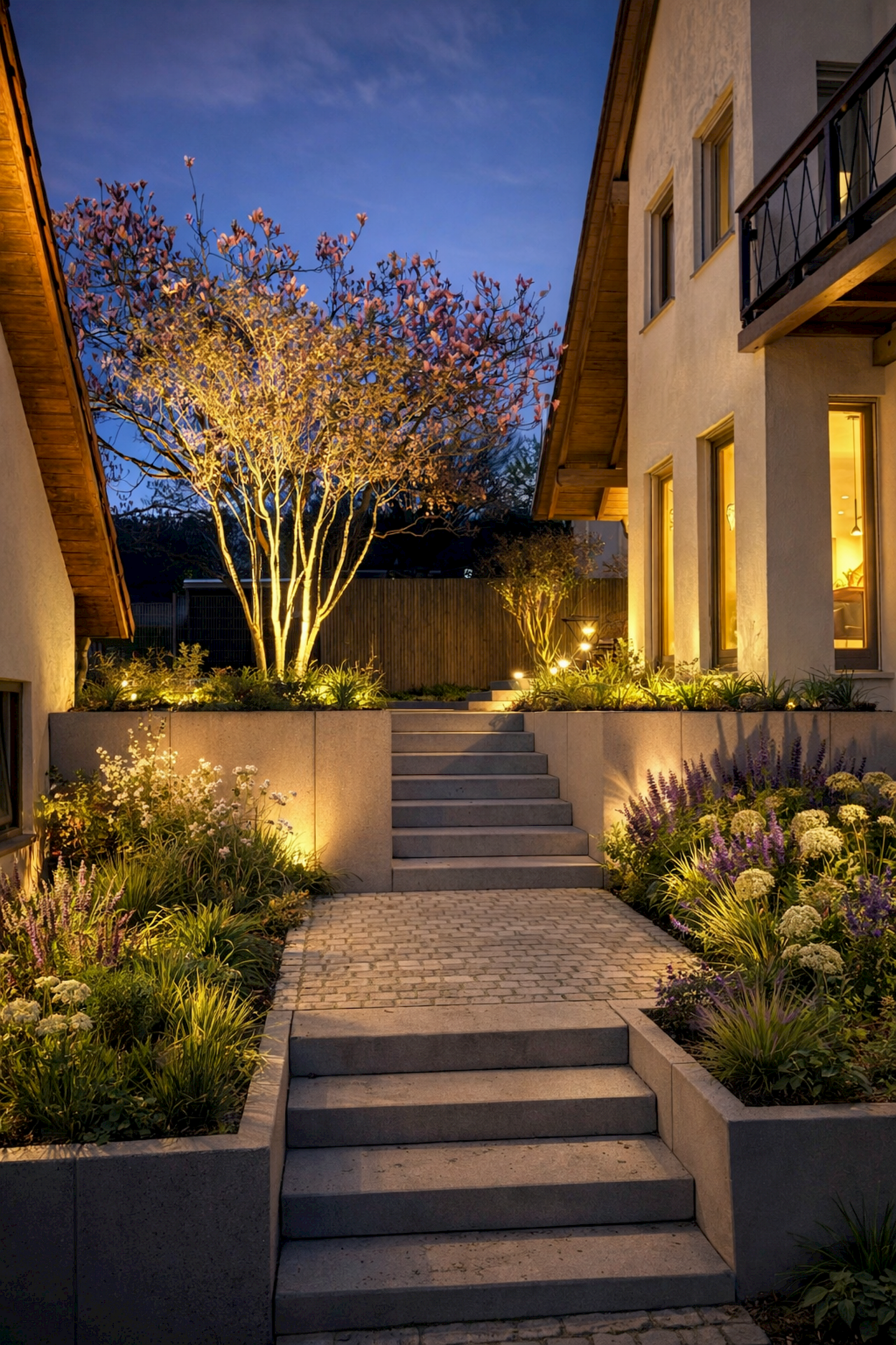 Beleuchtete Wege, Treppen und Eingangsbereiche erhöhen die Orientierung und reduzieren Unfallrisiken. Gleichzeitig trägt Licht zur Sicherheit rund um das Haus bei.