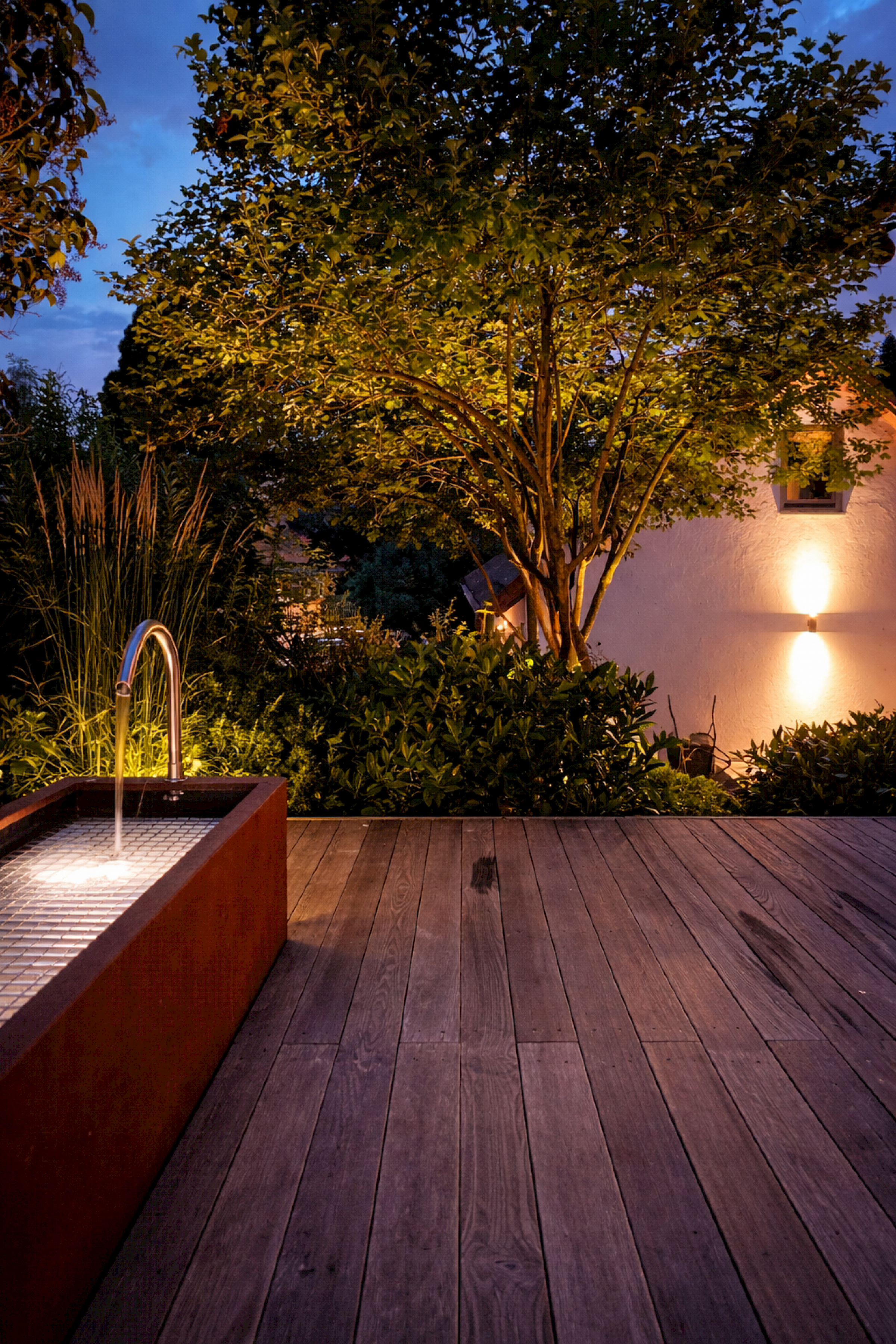 Licht unterstützt die Gliederung des Gartens. Sichtachsen, Höhenunterschiede und Gartenräume werden auch bei Dunkelheit erkennbar.