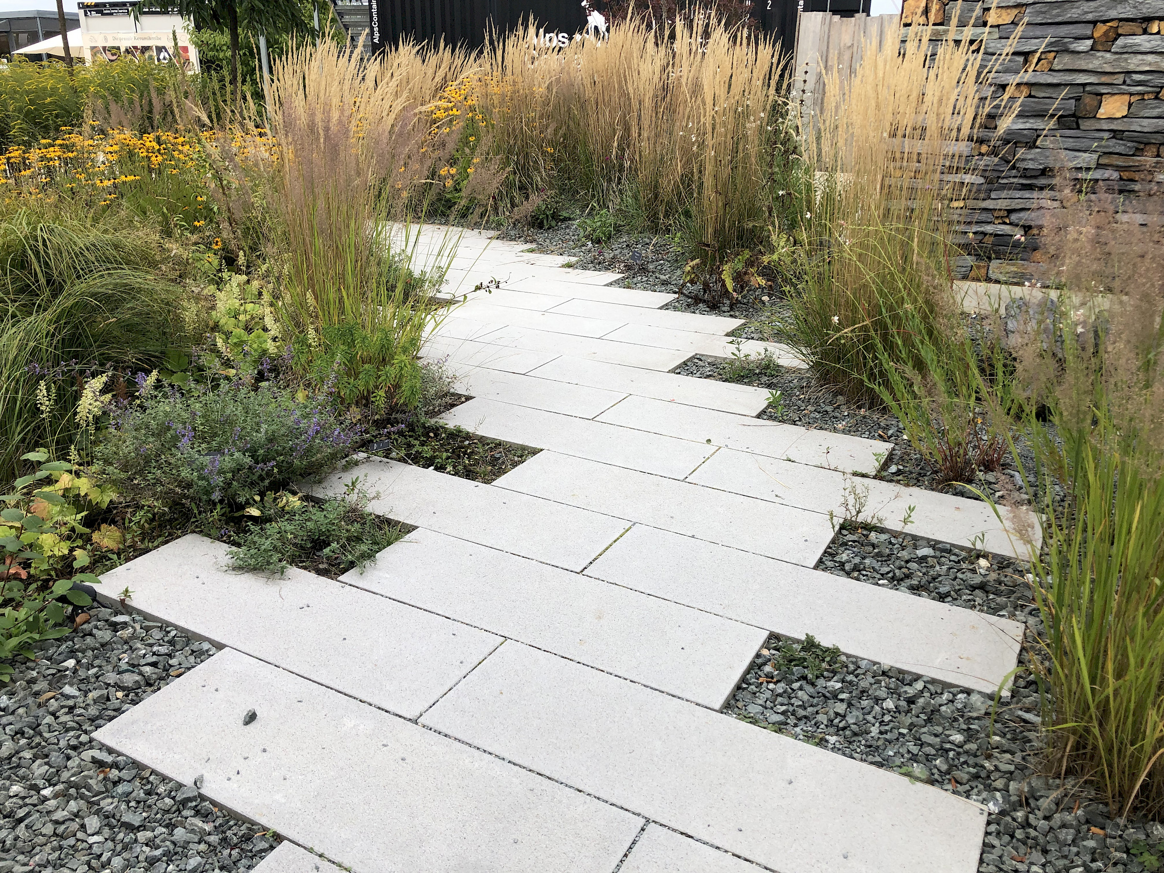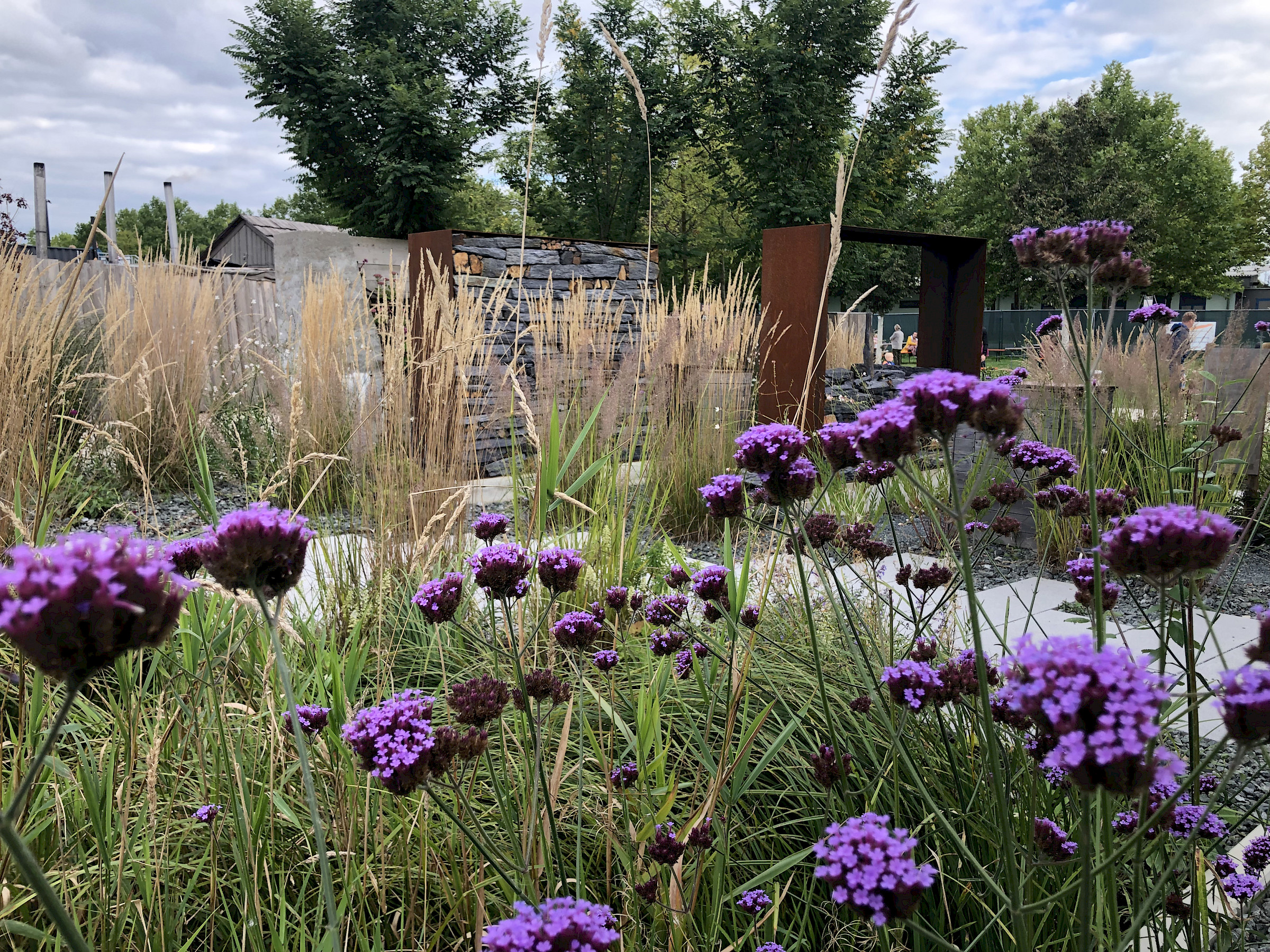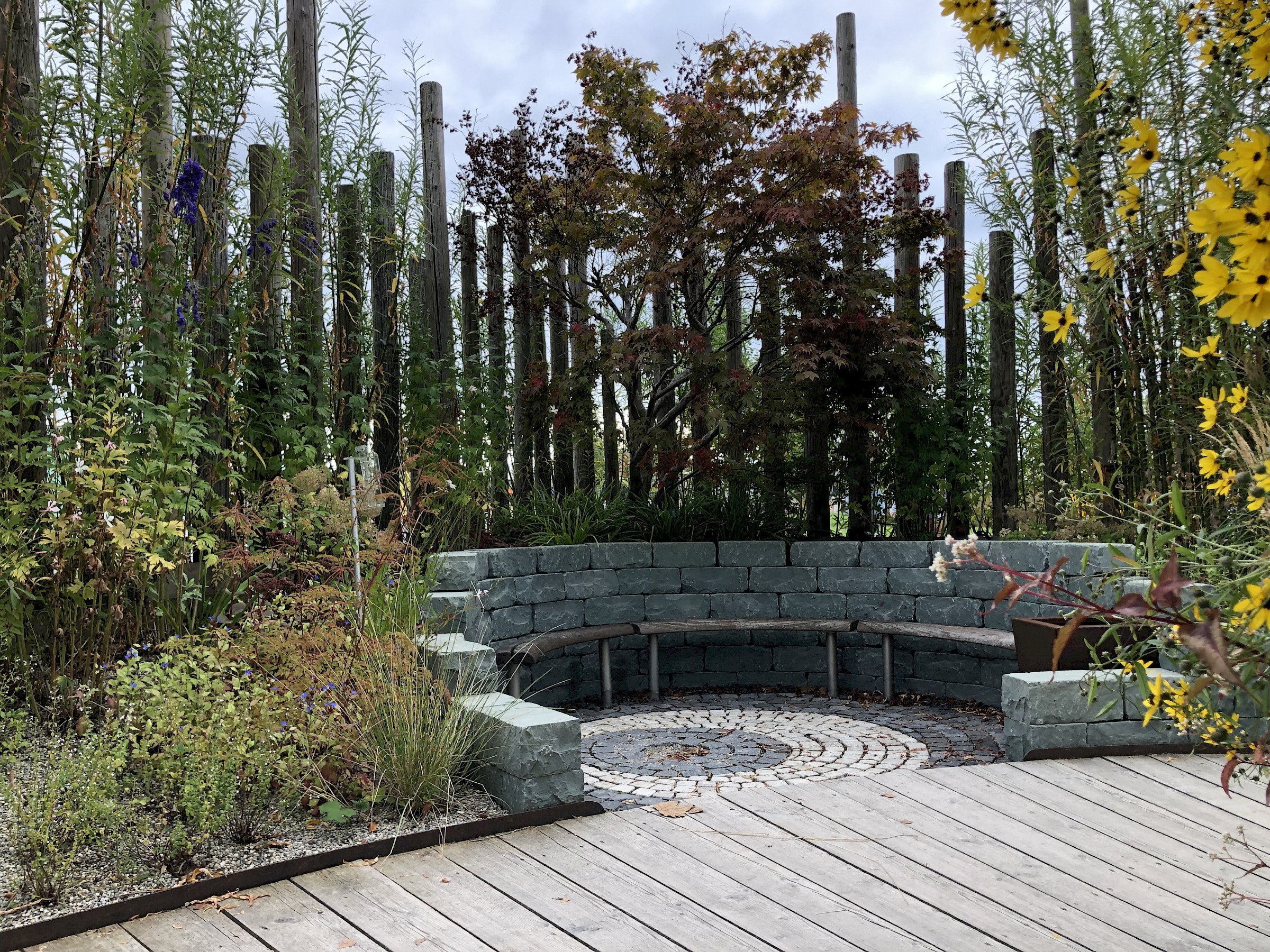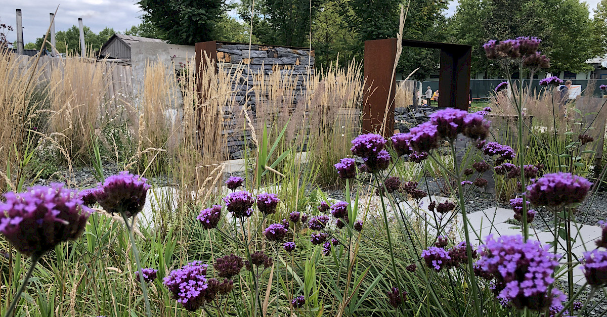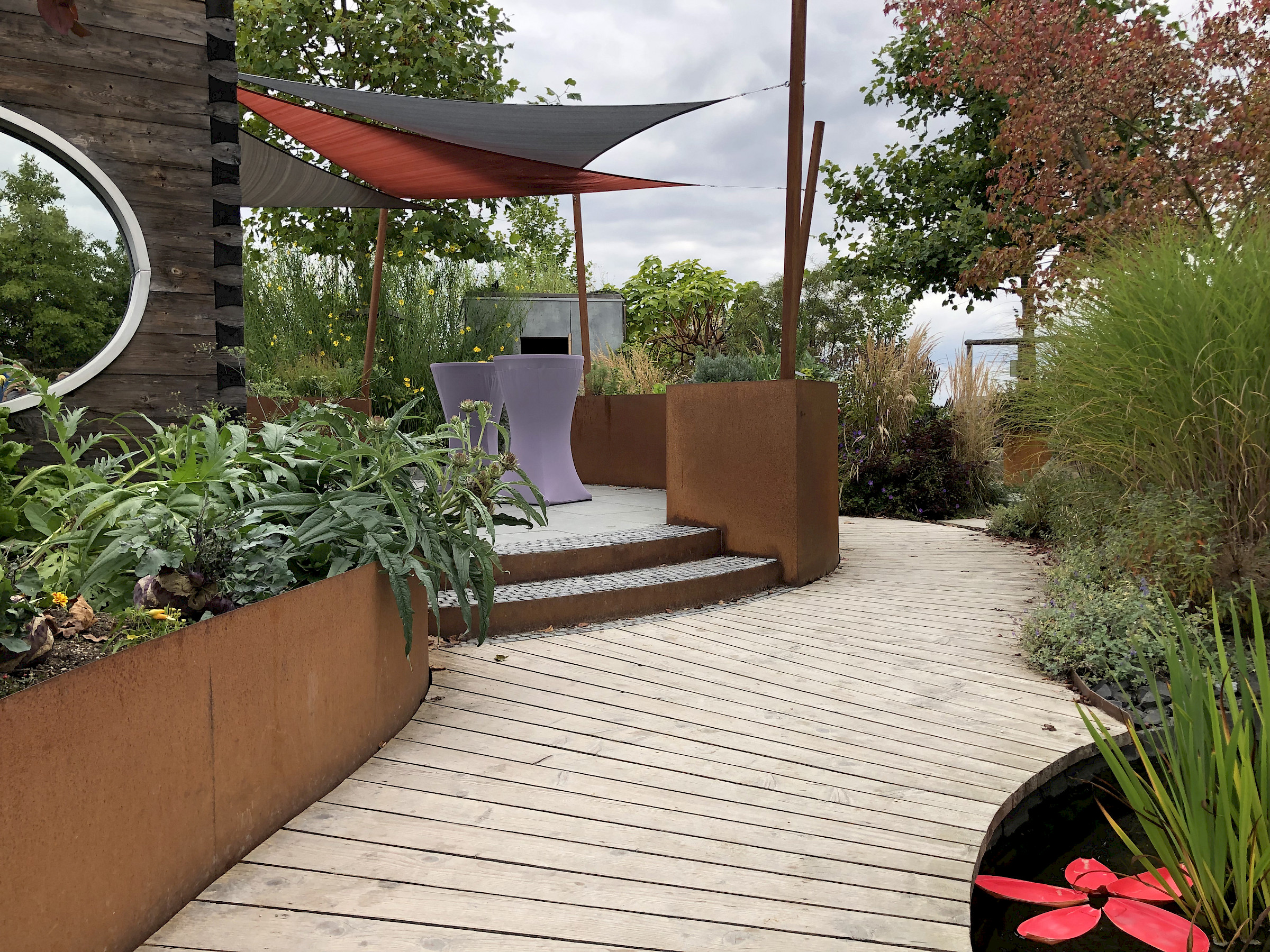 Unter diesem Titel baute die Firma Freisinger Gartenschmiede ihren Mustergarten. Hier stand das Thema Nachhaltigkeit im Vordergrund. Verwendete Materialien waren Cortenstahl, Holz und Natursteinmauern. Auch eine Gartensaune mit Wasserbecken wuden präsentiert.