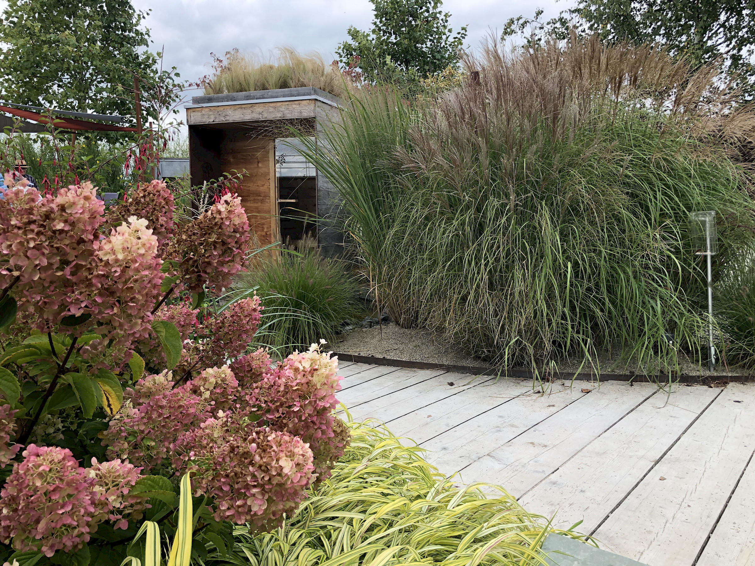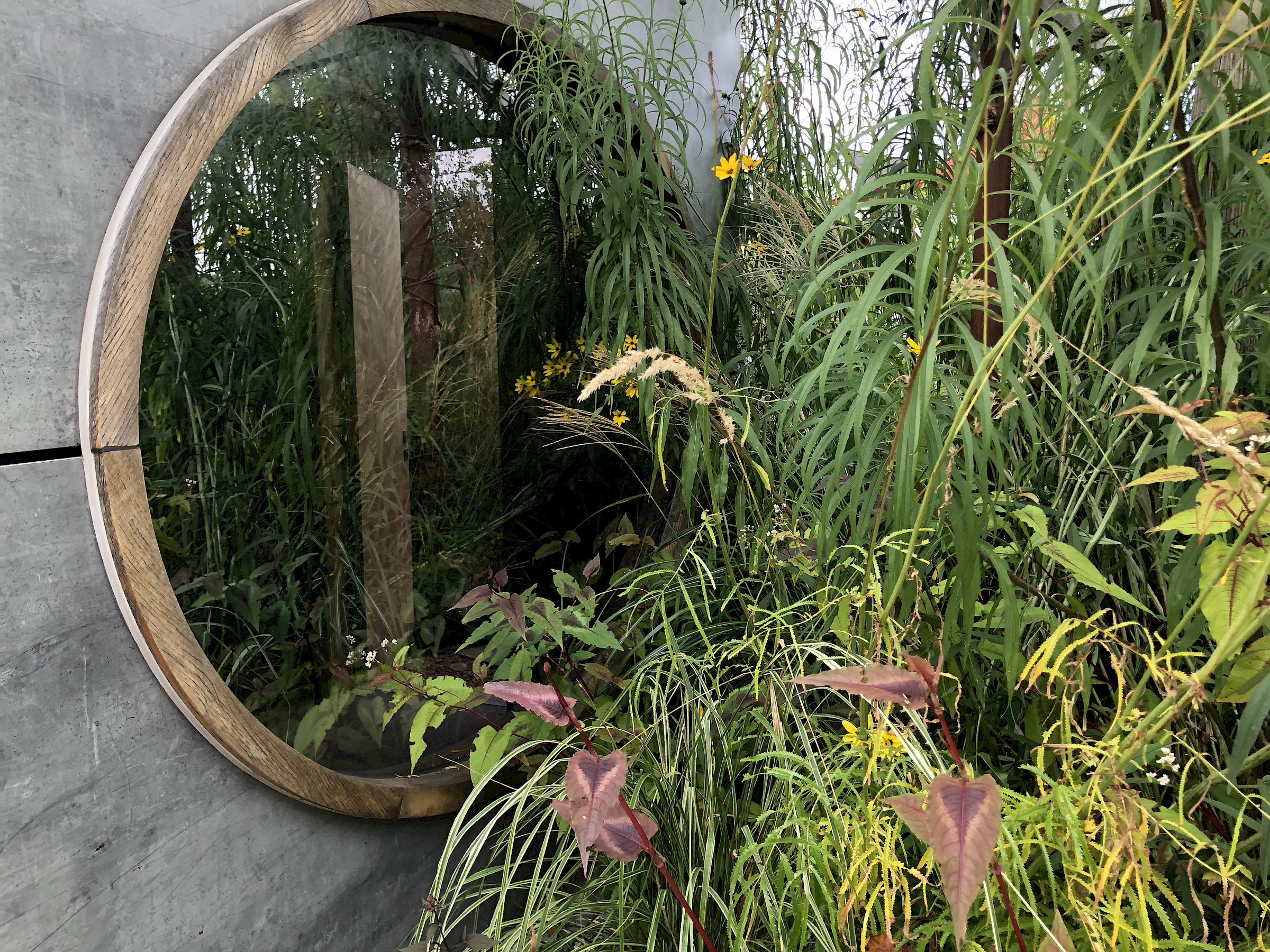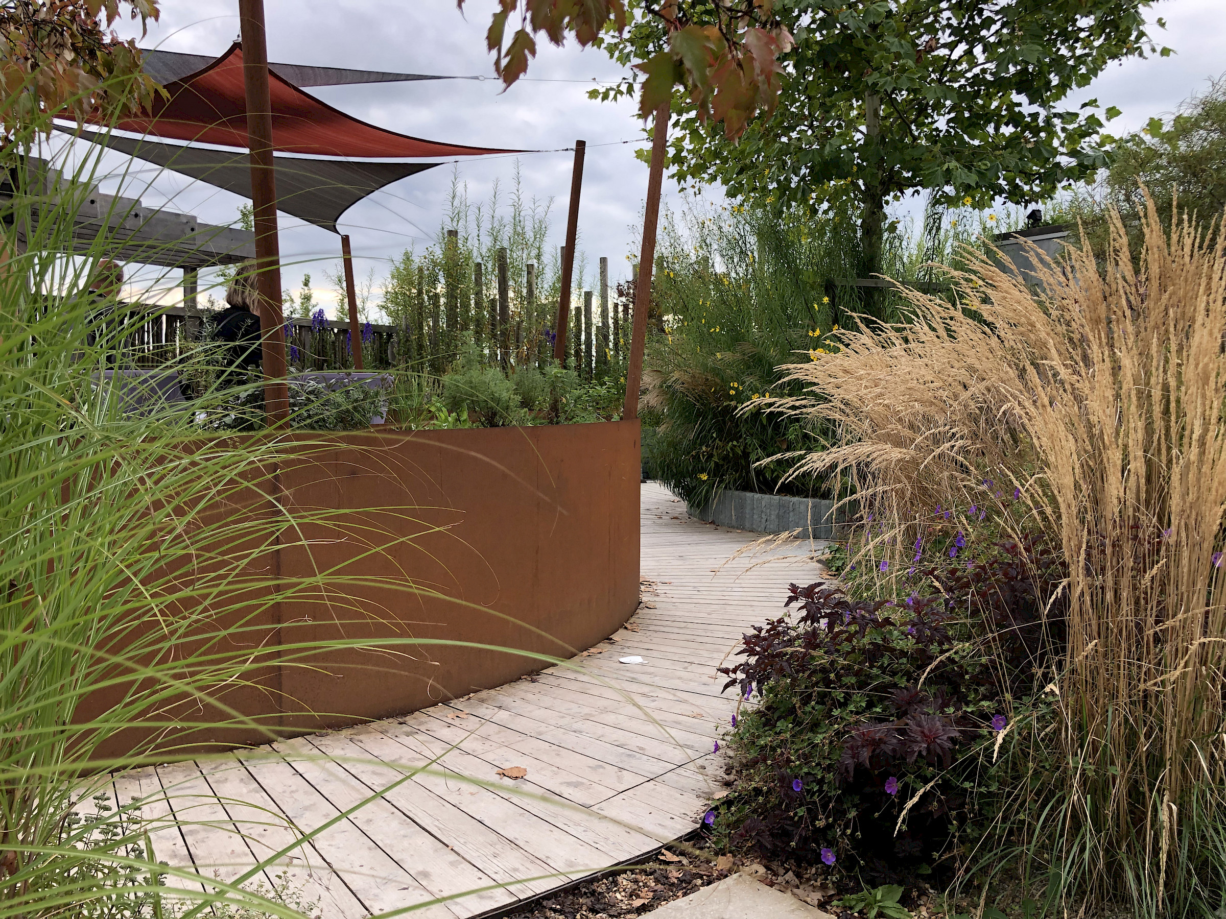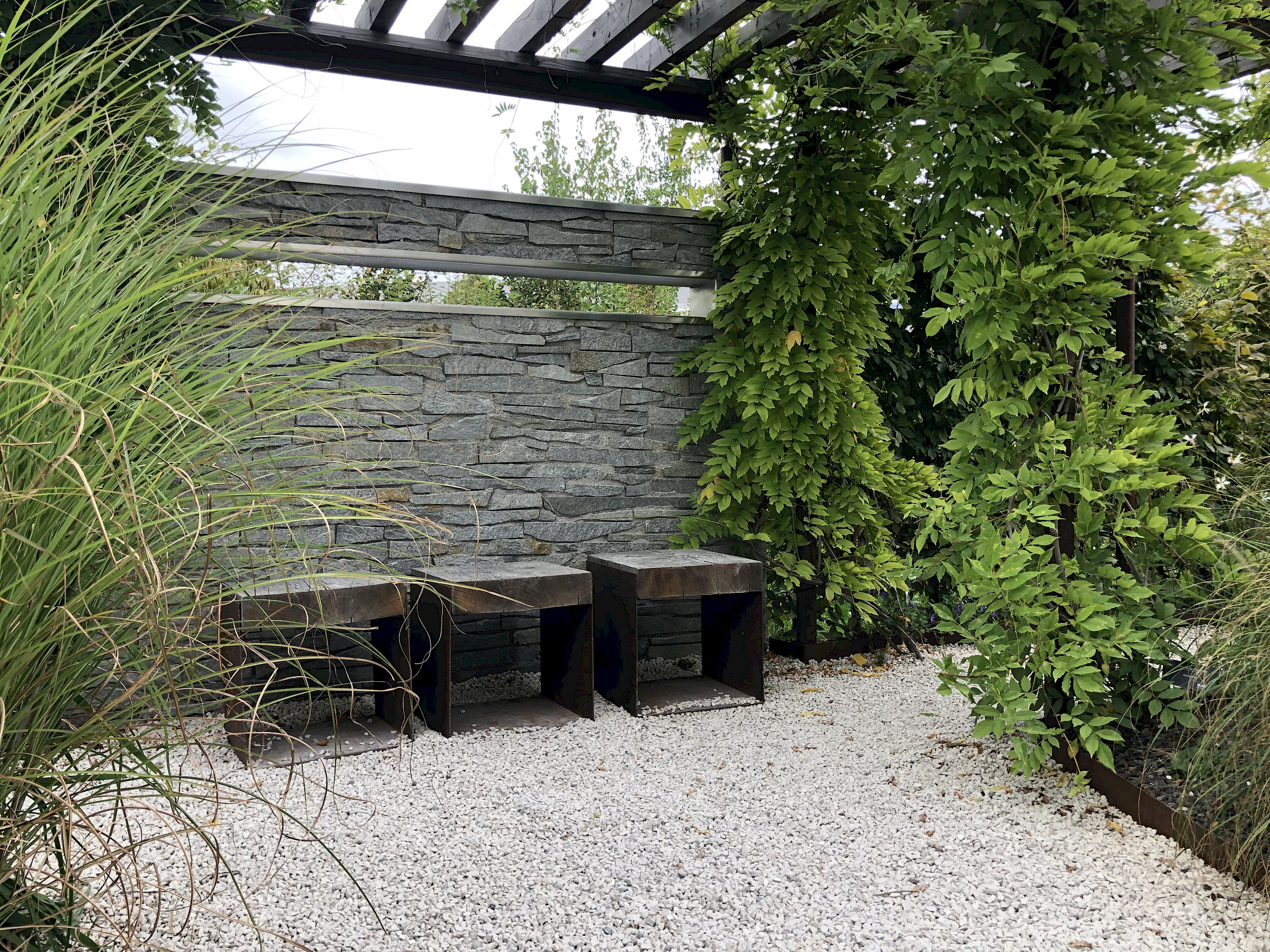 Unter diesem Titel baute die Firma Freisinger Gartenschmiede ihren Mustergarten. Hier stand das Thema Nachhaltigkeit im Vordergrund. Verwendete Materialien waren Cortenstahl, Holz und Natursteinmauern. Auch eine Gartensaune mit Wasserbecken wuden präsentiert.