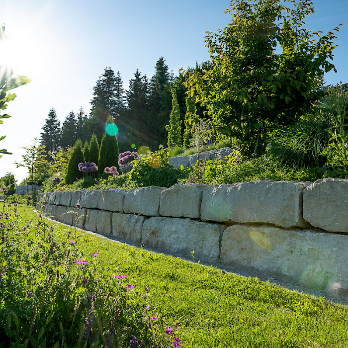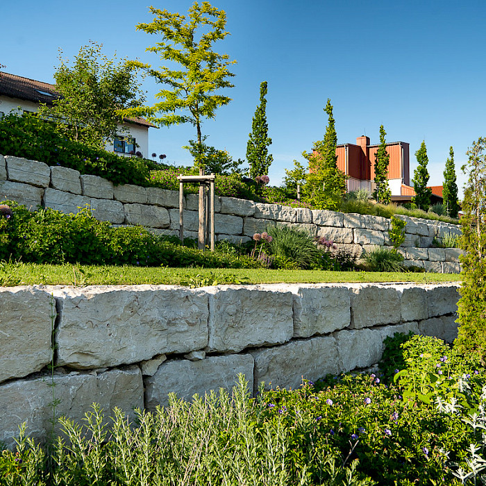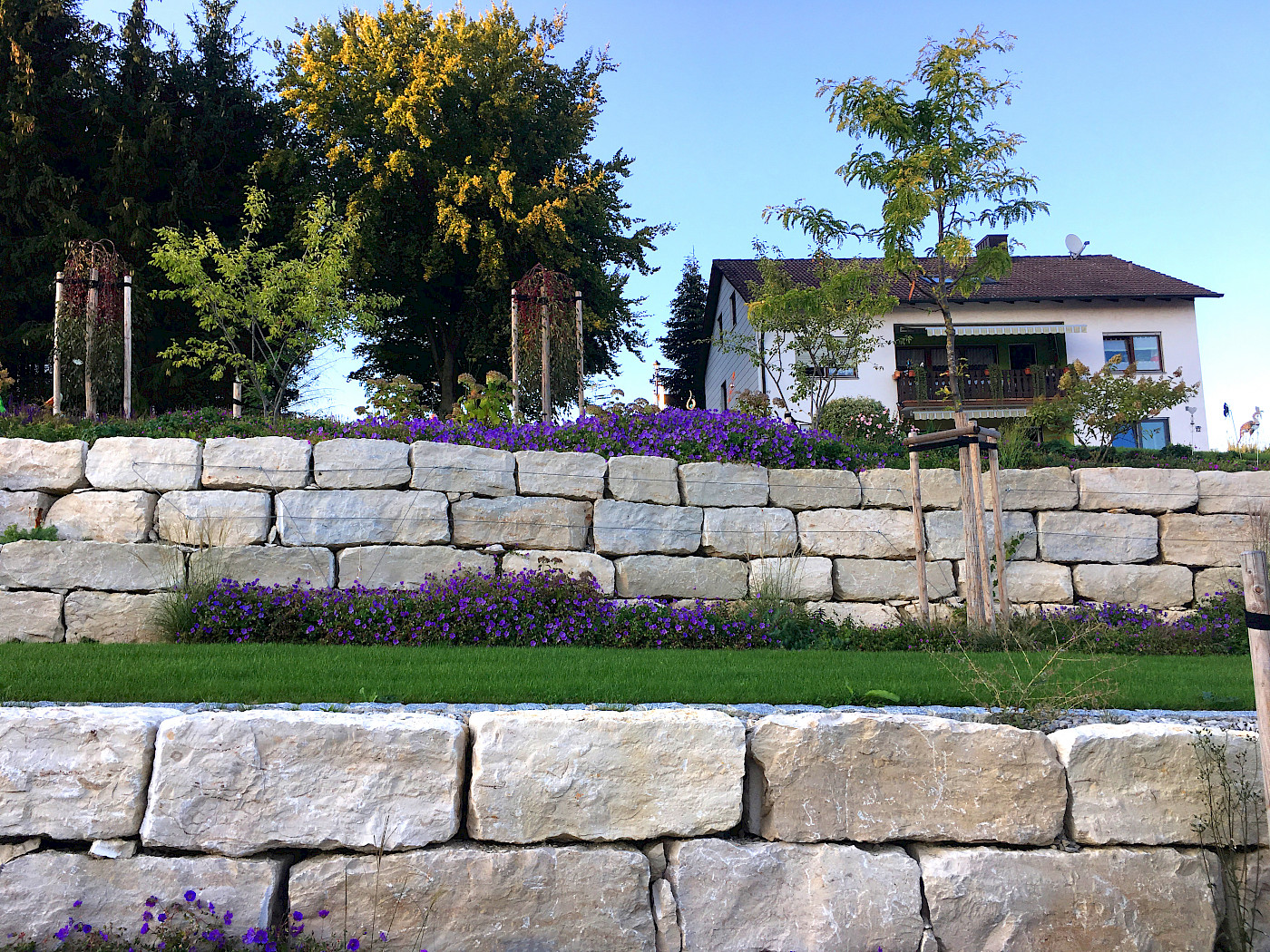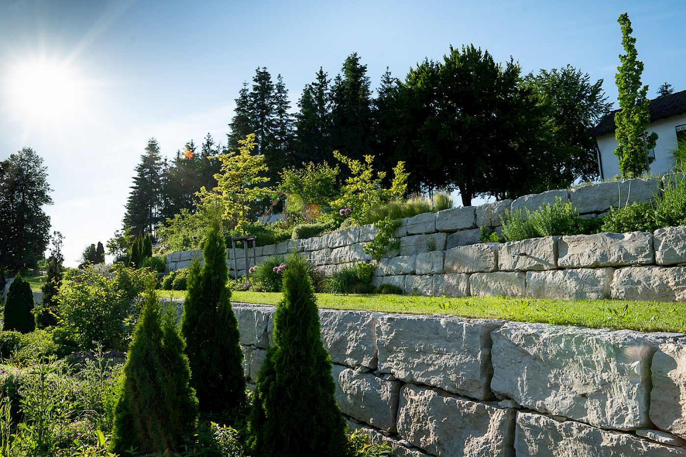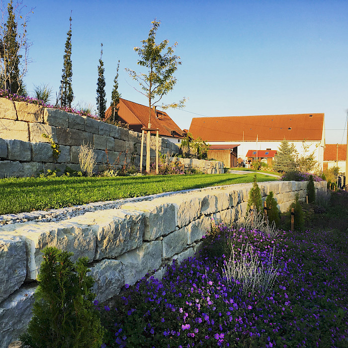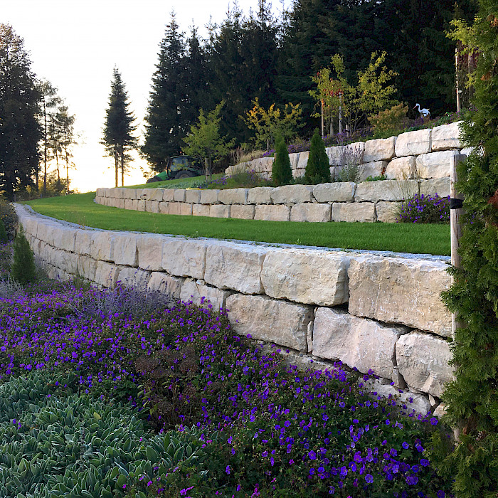 Neugestaltung eines Hanggartens mit Natursteinmauern aus Jura. Bepflanzung mit verschiedenen Gehölzen und pflegeleichten Stauden wie Geranium wallichianum 'Rozanne'.