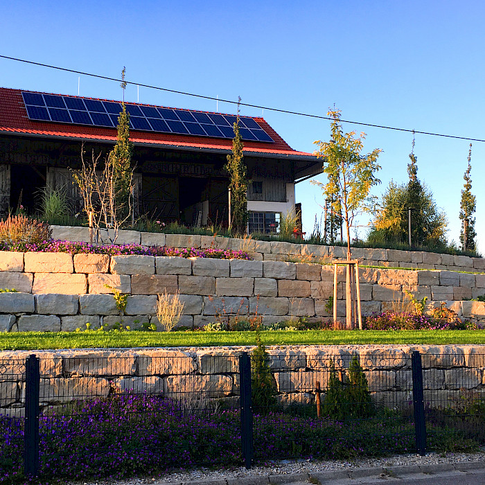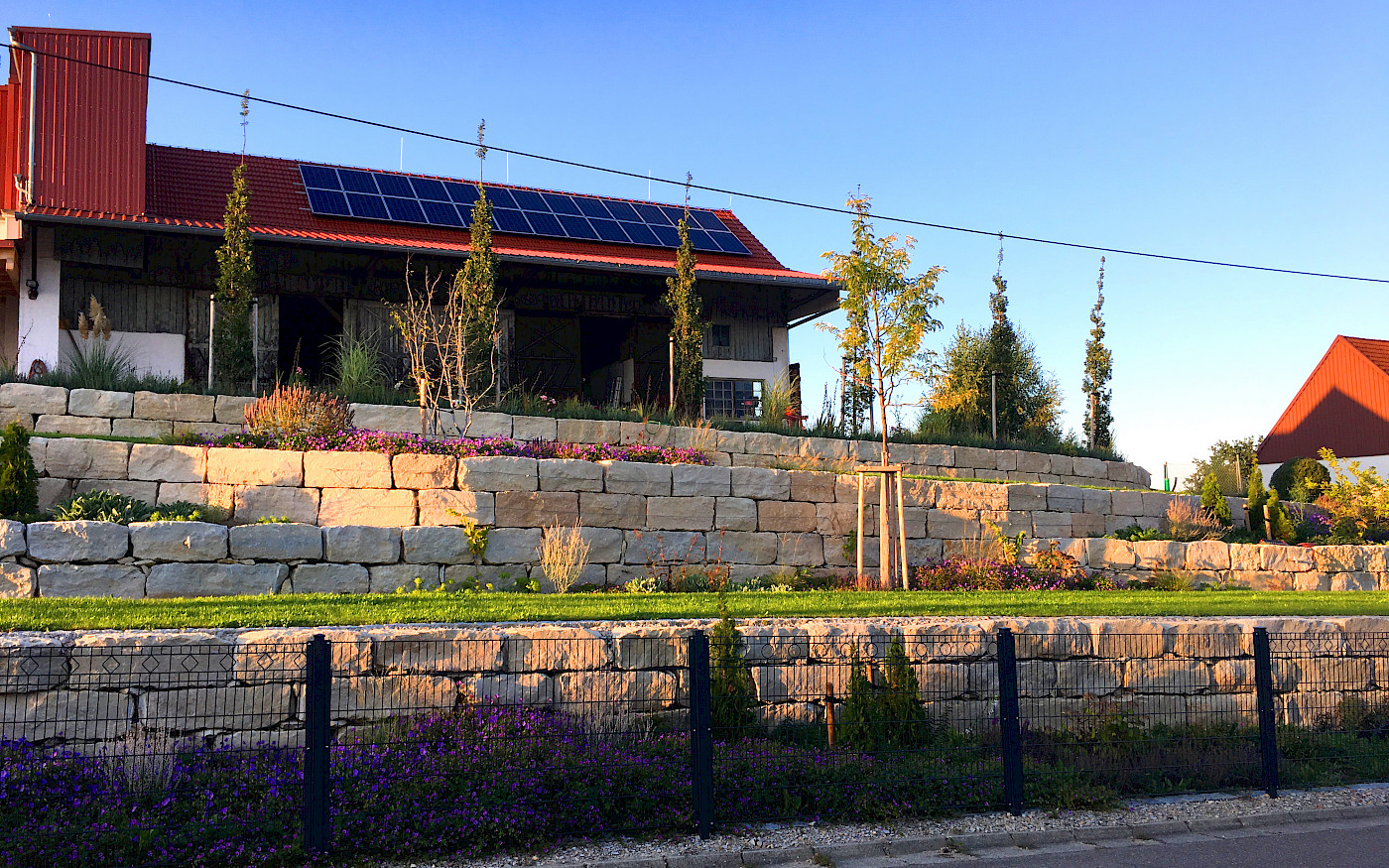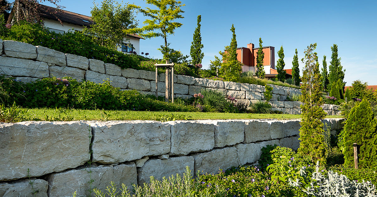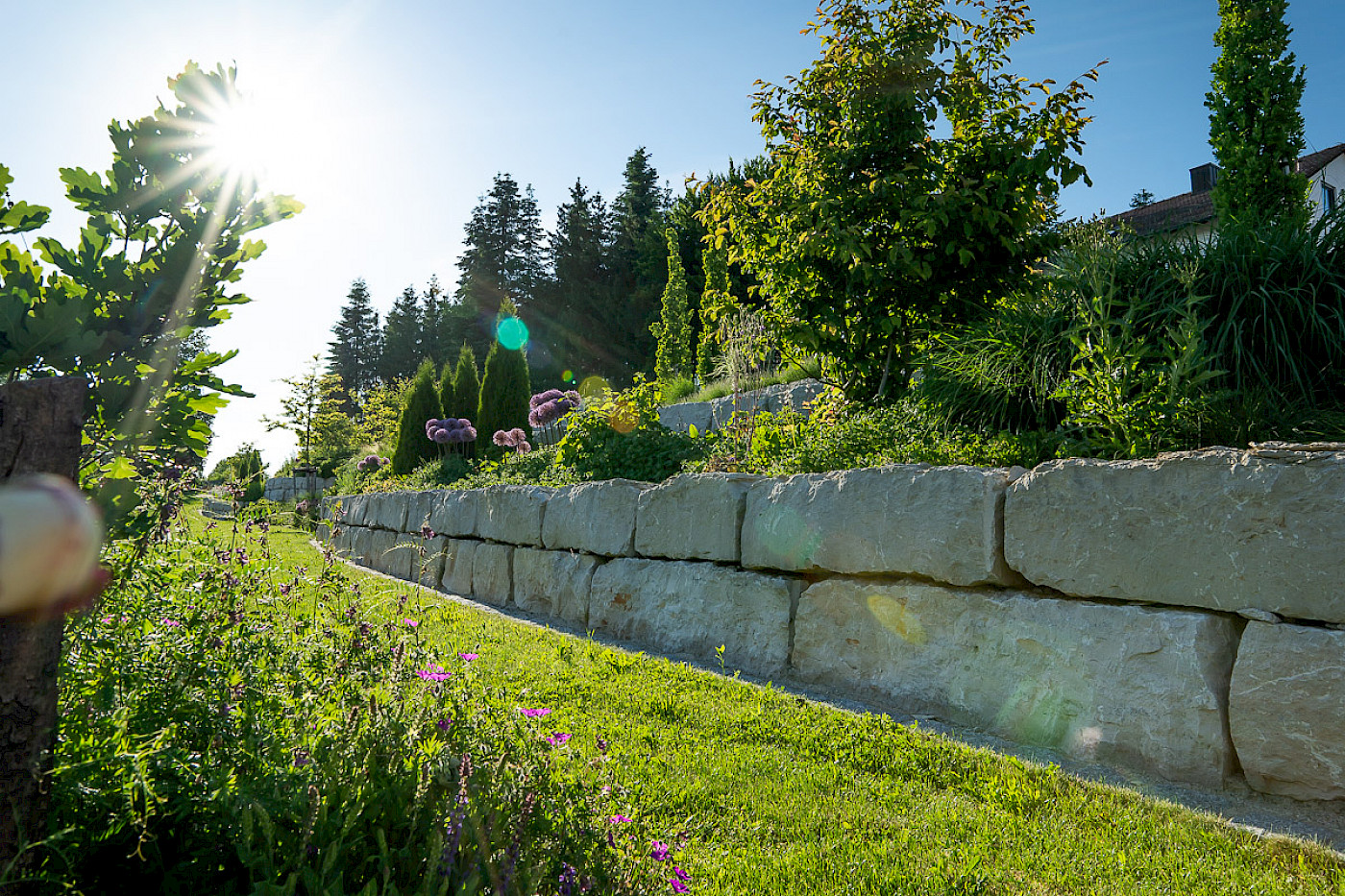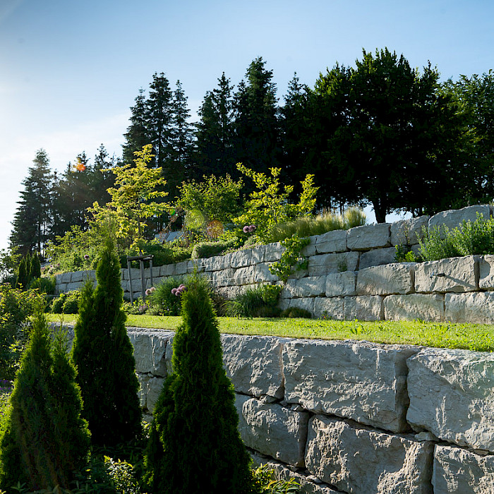Neugestaltung eines Hanggartens mit Natursteinmauern aus Jura. Bepflanzung mit verschiedenen Gehölzen und pflegeleichten Stauden wie Geranium wallichianum 'Rozanne'.