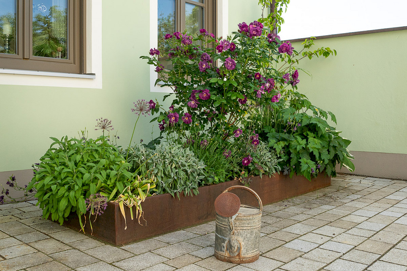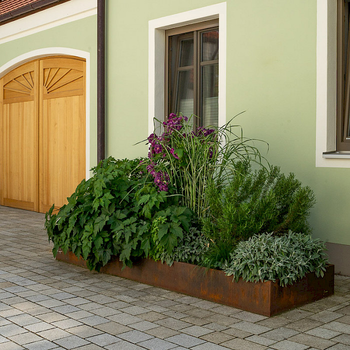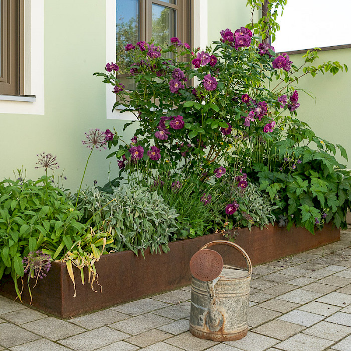 Neuanlage eines Privatgartens im Landhausstil. Der Garten erstreckt sich über mehrere Ebenen welche mit Mauern aus Klinker abgefangen sind. Einen großzügigen Übergang bilden die Stufen aus Granit. Zwei Terrassen auf unterschiedlichen Ebenen laden zum verweilen ein. Der Hof wurde mit einem Belag auf gesägtem Granitgroßstein gepflastert. Da der Bereich unterkellert ist wurden die Pflanflächen mittels einem Rahmen aus Cortenstahl erhöht.