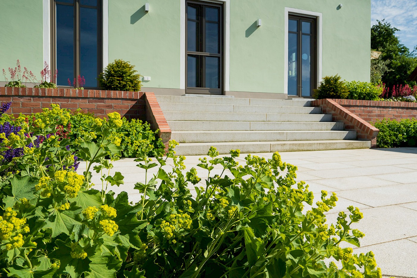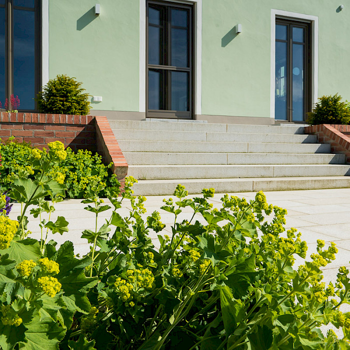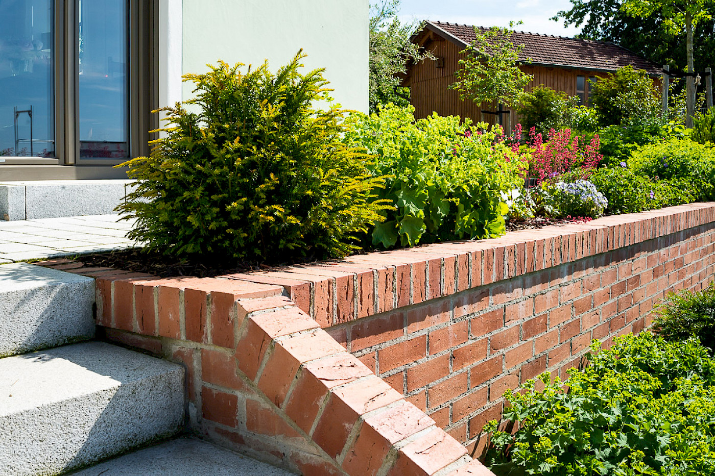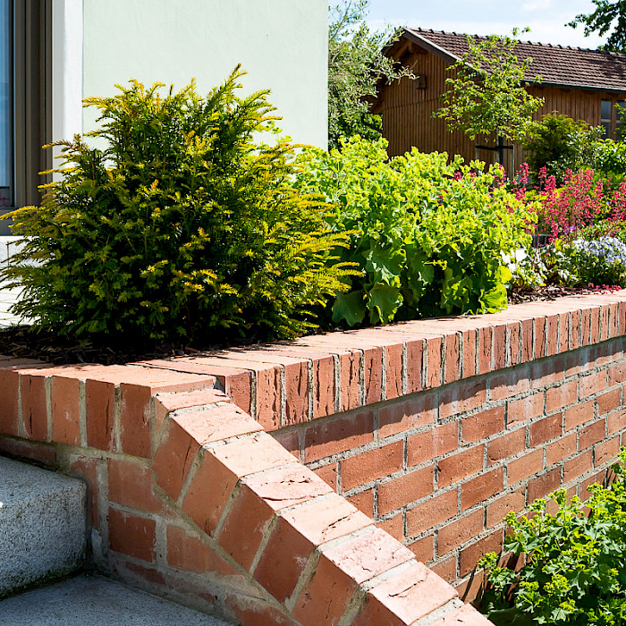 Materialien: Granitplatten, Klinkermauer, Granitgroßstein