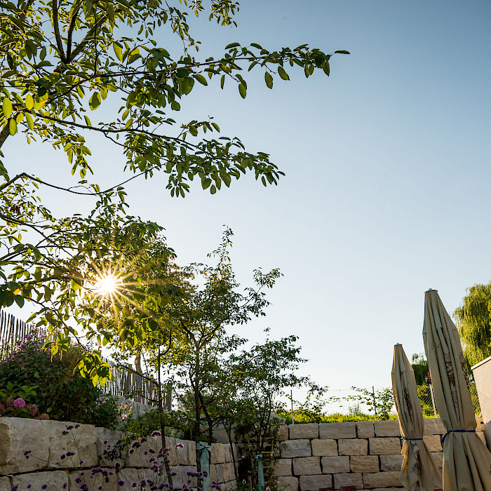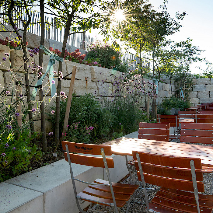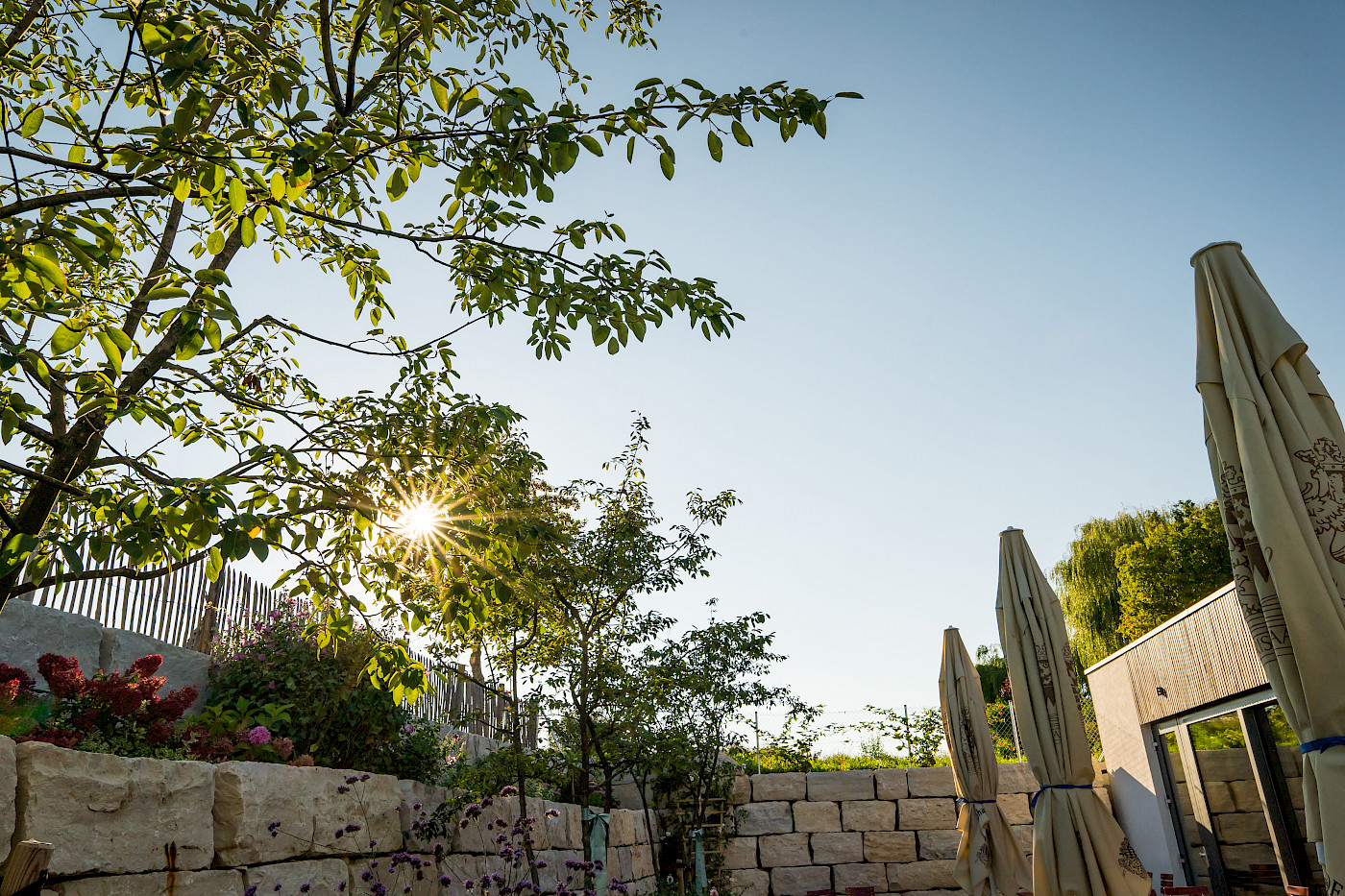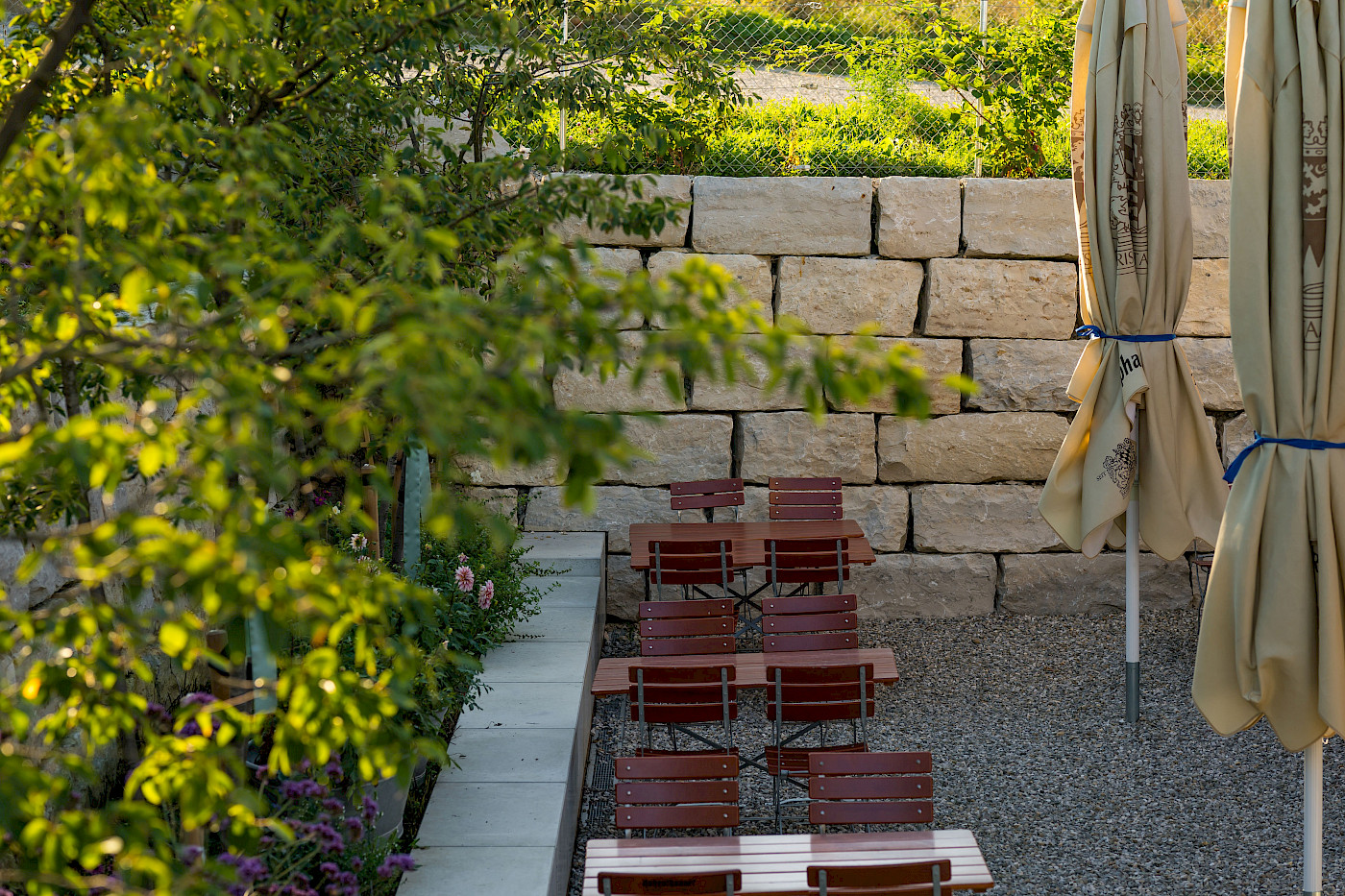 Besonderheiten: Hangabfangung mit Mauersteinen aus Jurakalk, Sitzmauer aus Beton