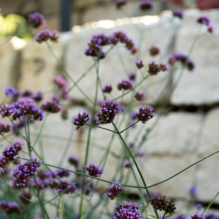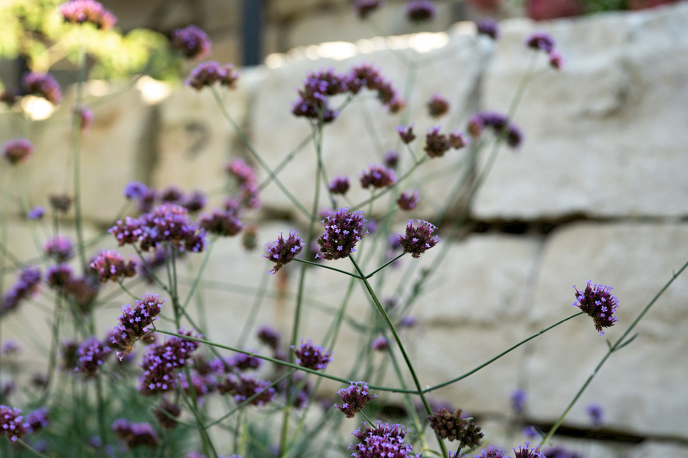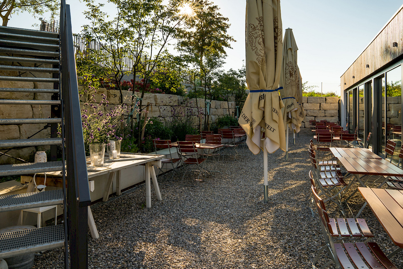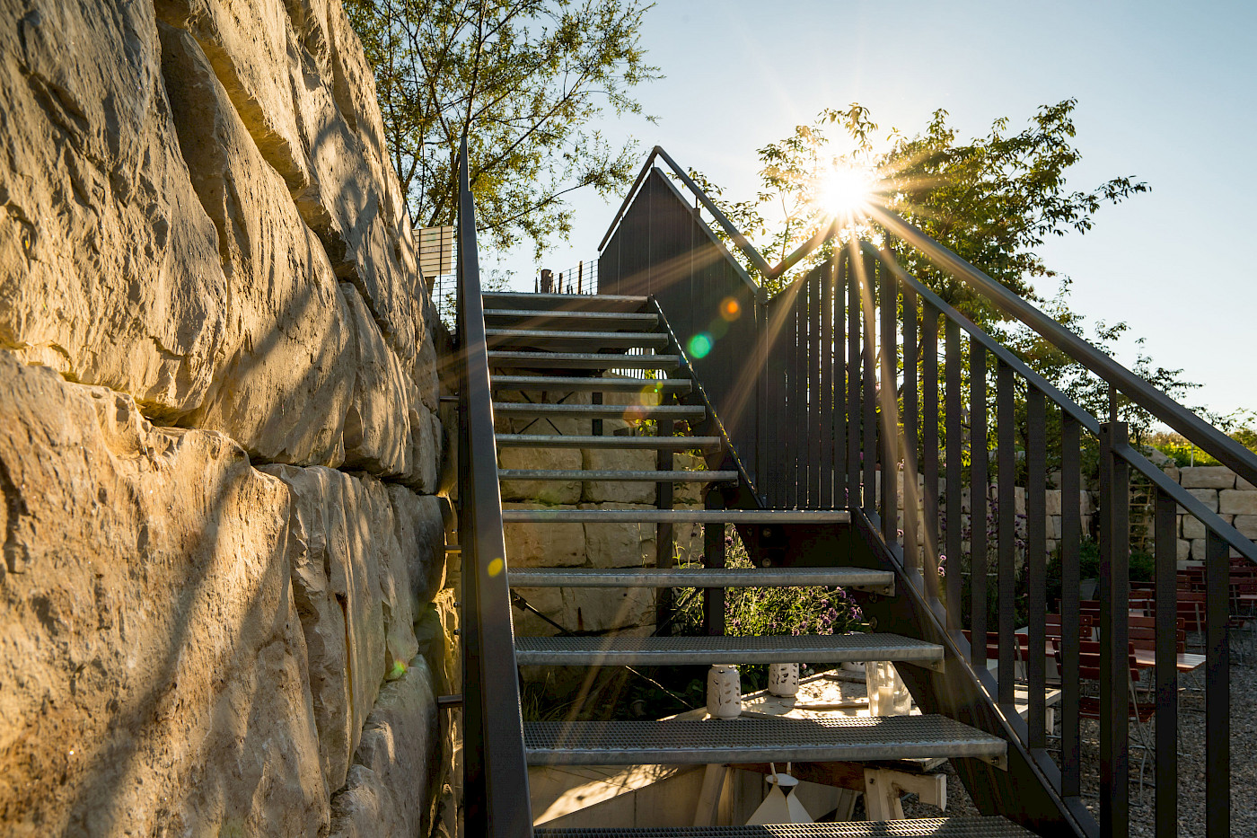 Besonderheiten: Hangabfangung mit Mauersteinen aus Jurakalk, Sitzmauer aus Beton