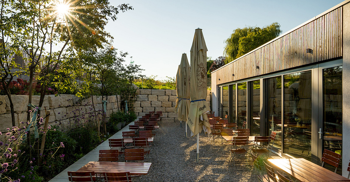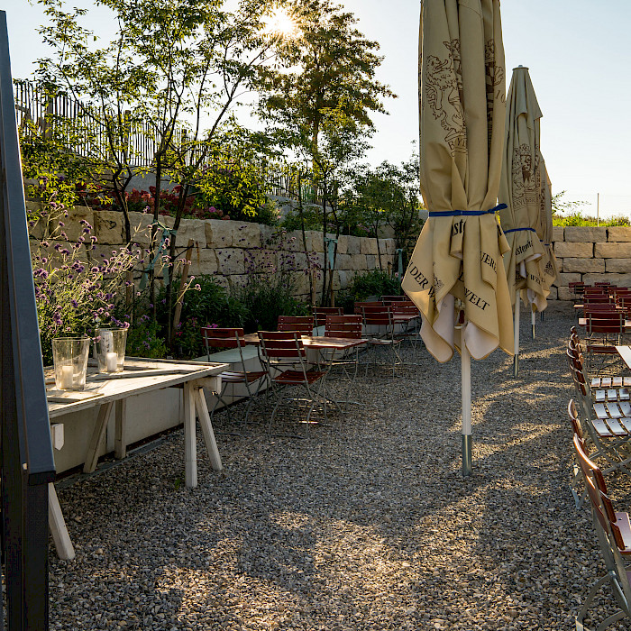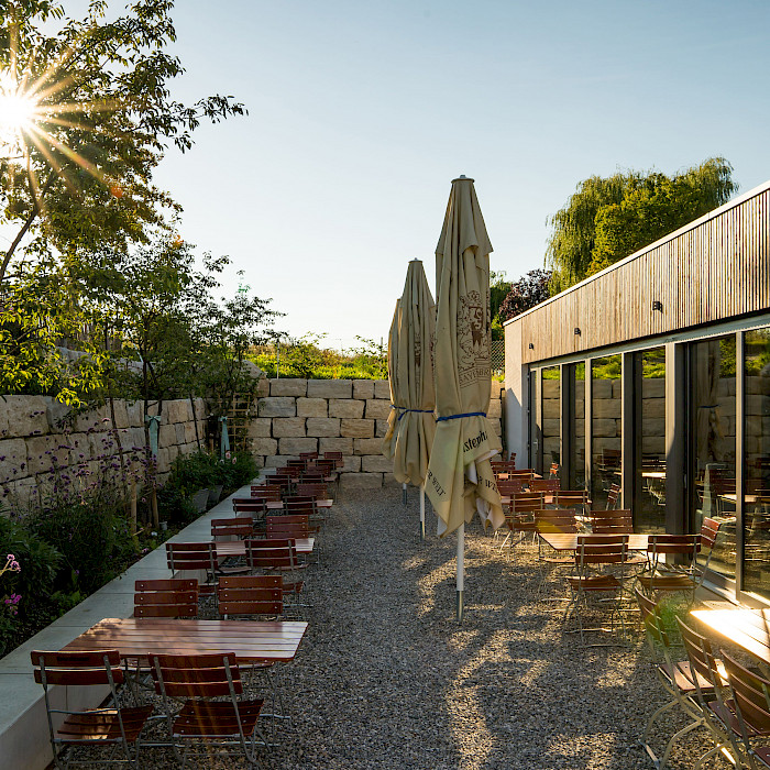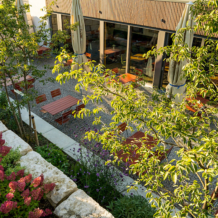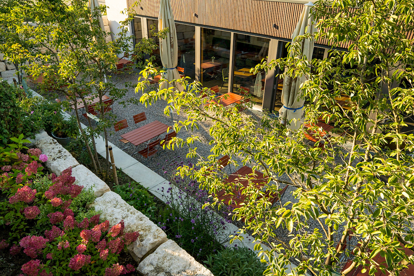 Planung des Eingangsbereiches sowie des Biergartens des Gasthauses Spitzer in Osterwaal im Landkreis Freising. Eine Besonderheit ist hier die Abfangung des Geländes mit Mauerblöcken aus Jurakalk. Eine lockere Sitzmauer aus Betonfertigteilen bildet den Abschluss des Sitzbereiches im Biergarten. Drei Amelanchier lamarckii (Kupferfelsenbirne) in Schirmform sorgen für eine gemütliche Atmosphäre.