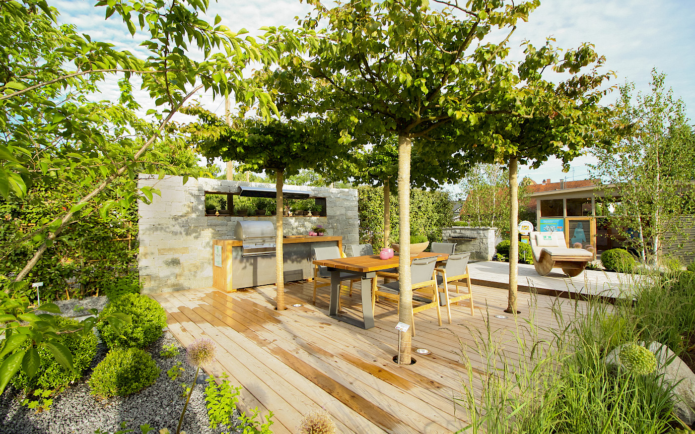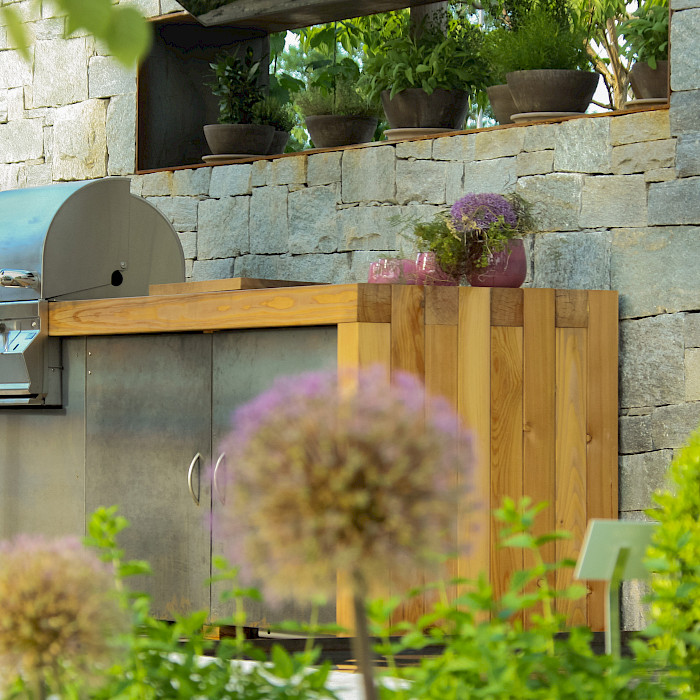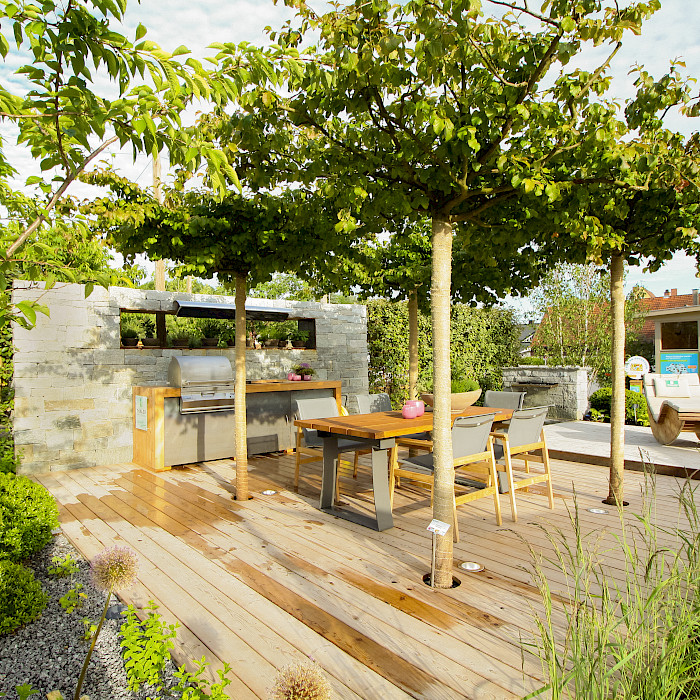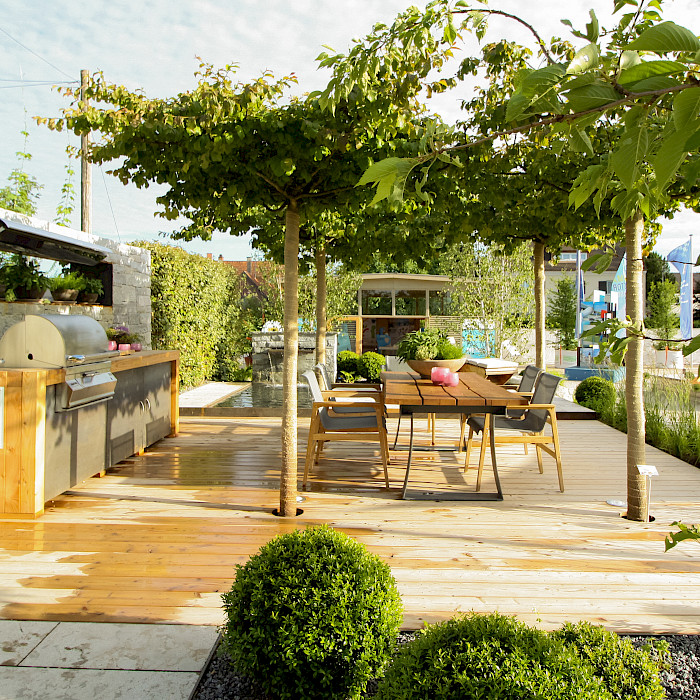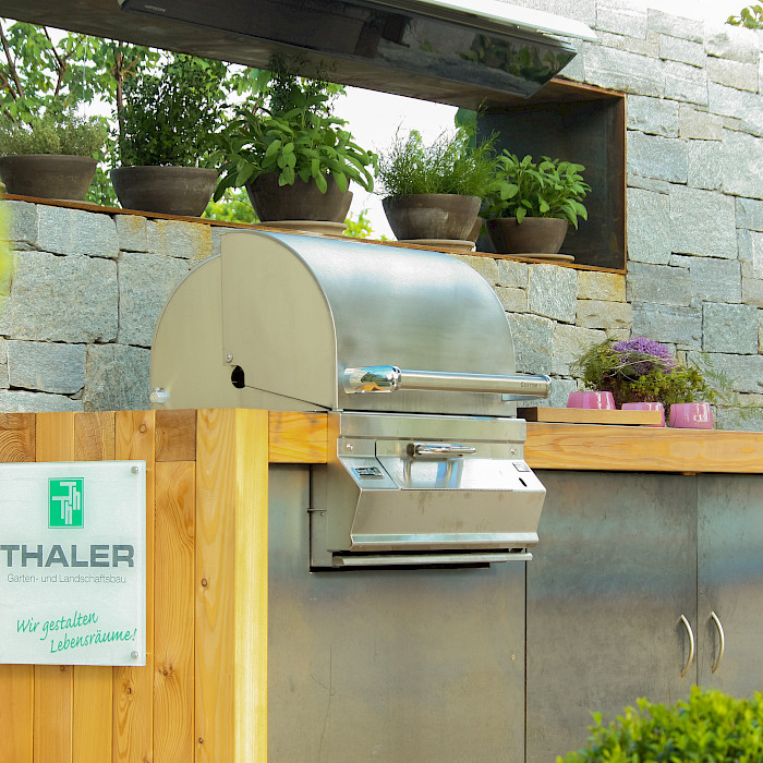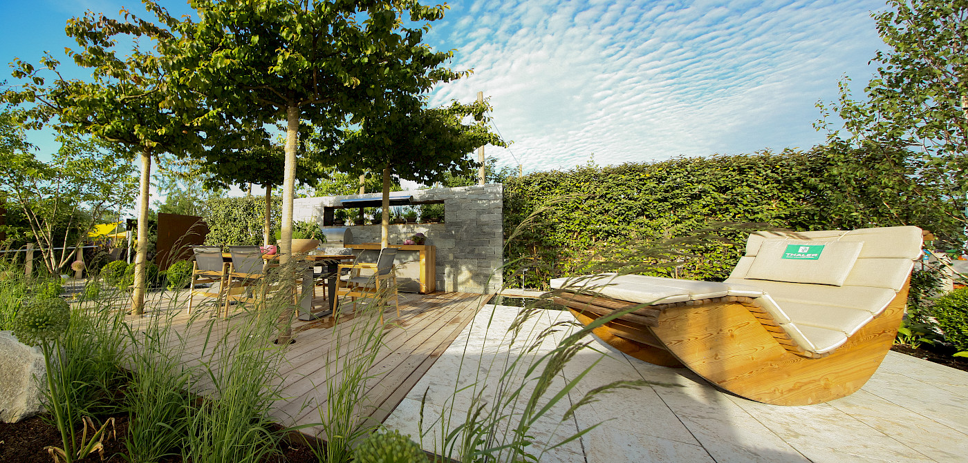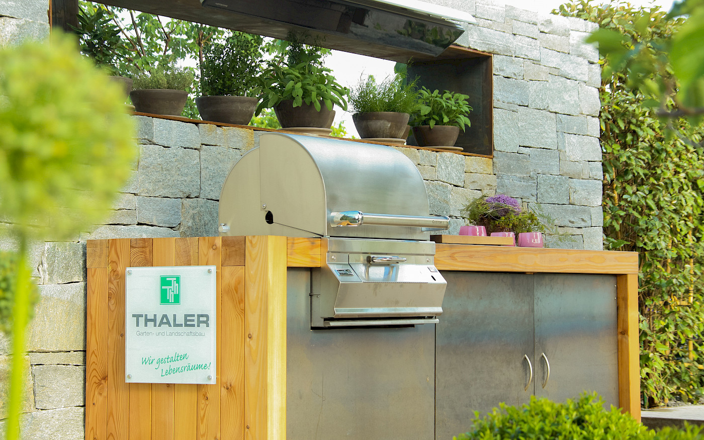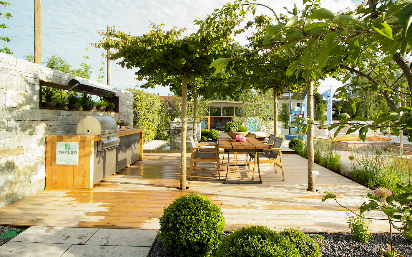 Planung eines Themengartens für die kleine Landesgartenschau Natur in Pfaffenhofen 2017 für die Firma Thaler. Ziel war es, auf kleiner Fläche den Garten als "erweitertes Wohnzimmer" zu präsentieren. Seitlich wird der Garten durch eine Natursteinwand mit Fenster begrenzt. Die Outdoorküche mit integriertem Gasgrill bildet das zentrale Objekt im Garten. Ein Holzdeck mit vier Eisenholzbäumen in Dachform gibt dem Essbereich mit großzügigem Tisch ein leichtes, grünes Dach. Der angrenzende Ruhebereich grenzt sich durch seinen Bodenbelag aus Natursteinplatten ab. Eine breite Wasserschütte mit Becken bringt auch das Element Wasser in den kleinen Garten und sorgt für eine entspannte Atmosphäre. Dieser Schaugarten zeigt, wie mit einer guten Gartengestaltung auch Gärten auf kleinstem Raum zu einem echten Higlight werden können.