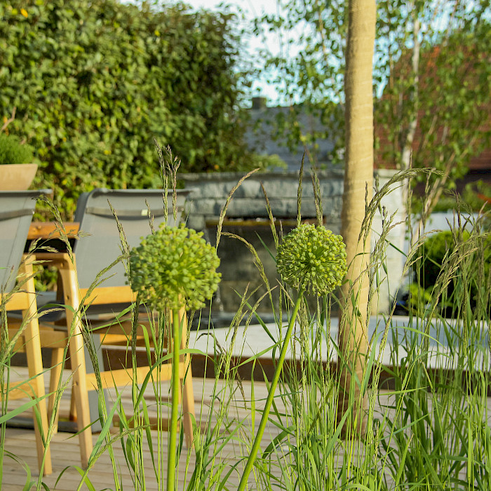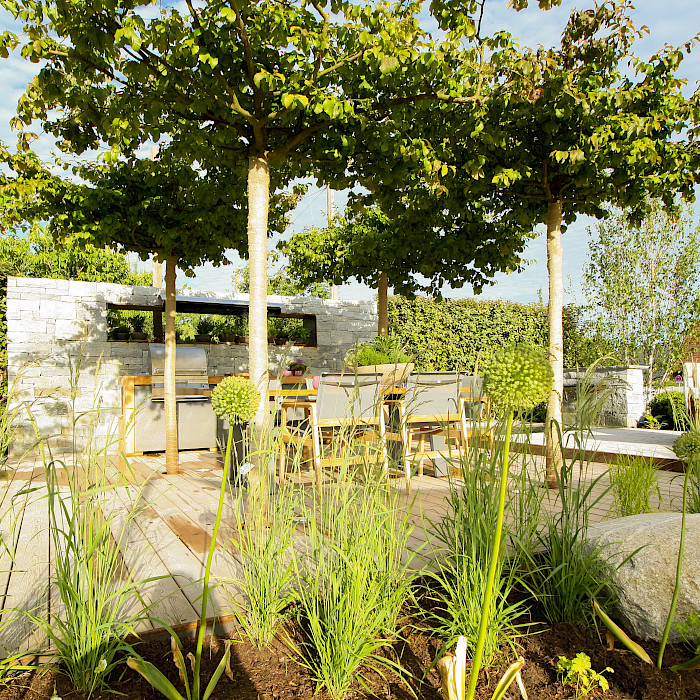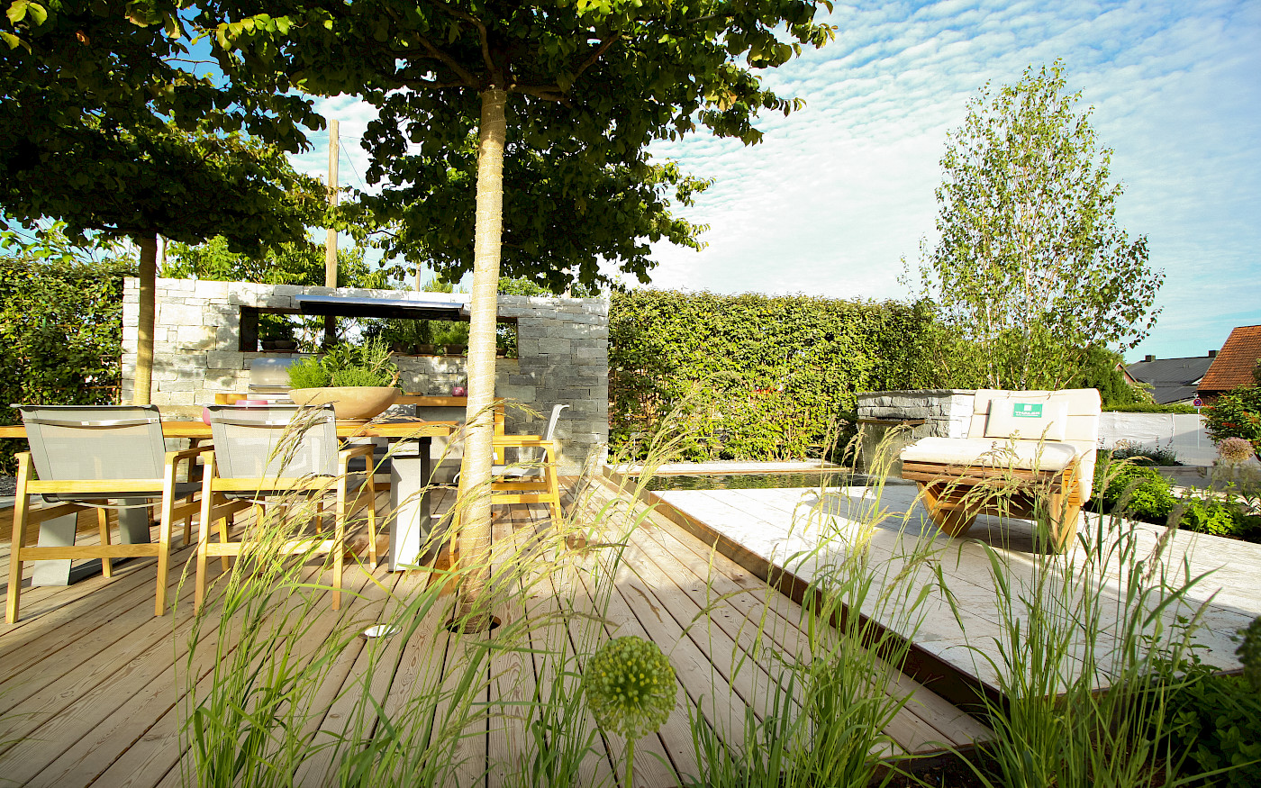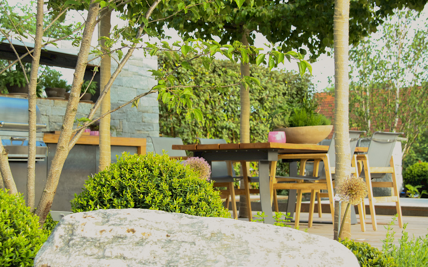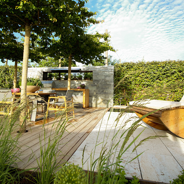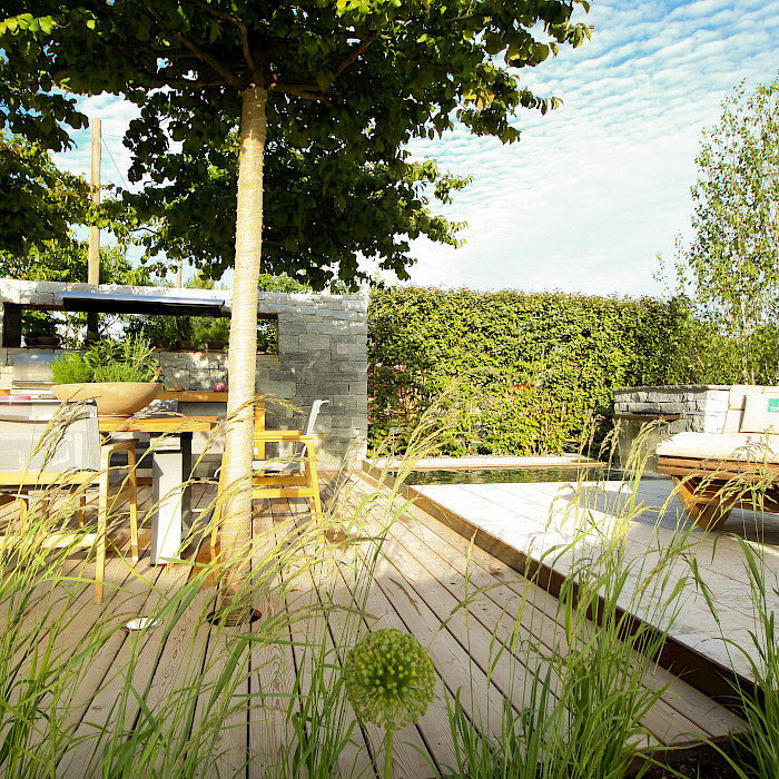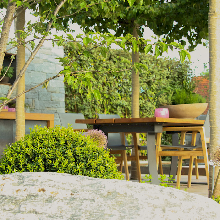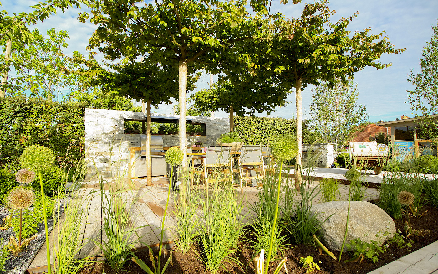 Planung eines Themengartens für die kleine Landesgartenschau Natur in Pfaffenhofen 2017 für die Firma Thaler. Ziel war es, auf kleiner Fläche den Garten als "erweitertes Wohnzimmer" zu präsentieren. Seitlich wird der Garten durch eine Natursteinwand mit Fenster begrenzt. Die Outdoorküche mit integriertem Gasgrill bildet das zentrale Objekt im Garten. Ein Holzdeck mit vier Eisenholzbäumen in Dachform gibt dem Essbereich mit großzügigem Tisch ein leichtes, grünes Dach. Der angrenzende Ruhebereich grenzt sich durch seinen Bodenbelag aus Natursteinplatten ab. Eine breite Wasserschütte mit Becken bringt auch das Element Wasser in den kleinen Garten und sorgt für eine entspannte Atmosphäre. Dieser Schaugarten zeigt, wie mit einer guten Gartengestaltung auch Gärten auf kleinstem Raum zu einem echten Higlight werden können.