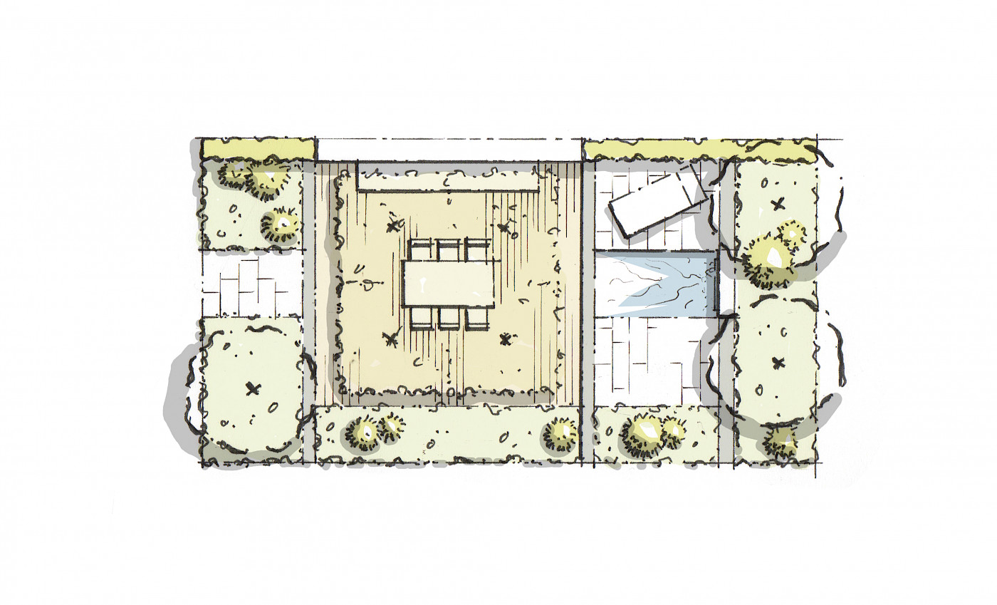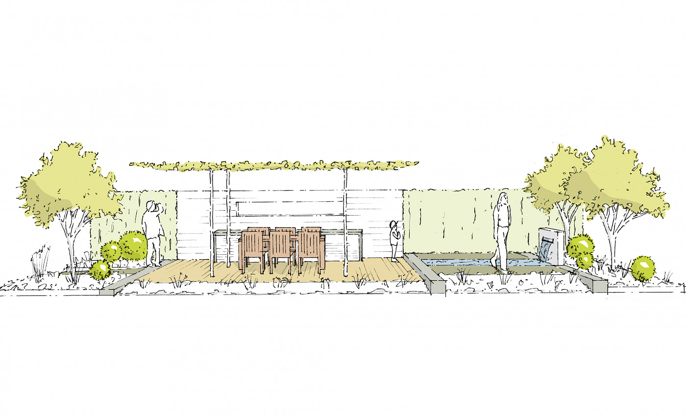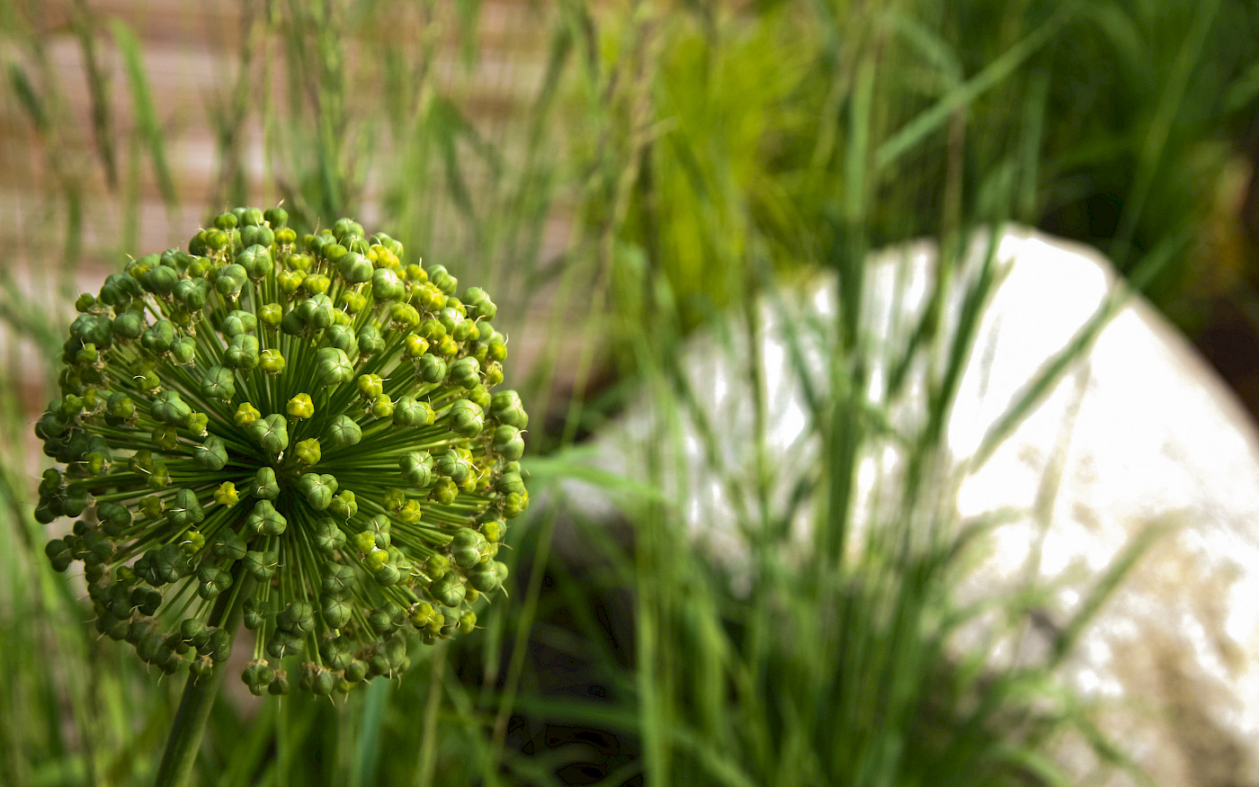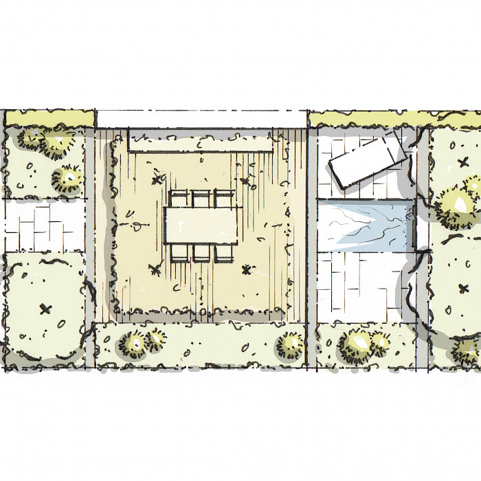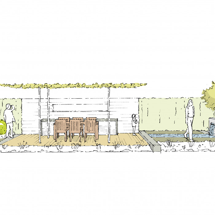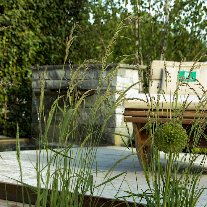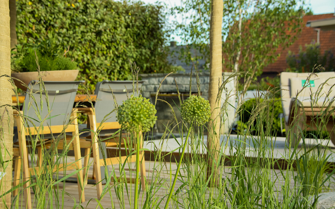 Planung eines Themengartens für die kleine Landesgartenschau Natur in Pfaffenhofen 2017 für die Firma Thaler. Ziel war es, auf kleiner Fläche den Garten als "erweitertes Wohnzimmer" zu präsentieren. Seitlich wird der Garten durch eine Natursteinwand mit Fenster begrenzt. Die Outdoorküche mit integriertem Gasgrill bildet das zentrale Objekt im Garten. Ein Holzdeck mit vier Eisenholzbäumen in Dachform gibt dem Essbereich mit großzügigem Tisch ein leichtes, grünes Dach. Der angrenzende Ruhebereich grenzt sich durch seinen Bodenbelag aus Natursteinplatten ab. Eine breite Wasserschütte mit Becken bringt auch das Element Wasser in den kleinen Garten und sorgt für eine entspannte Atmosphäre. Dieser Schaugarten zeigt, wie mit einer guten Gartengestaltung auch Gärten auf kleinstem Raum zu einem echten Higlight werden können.