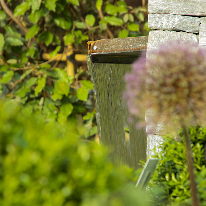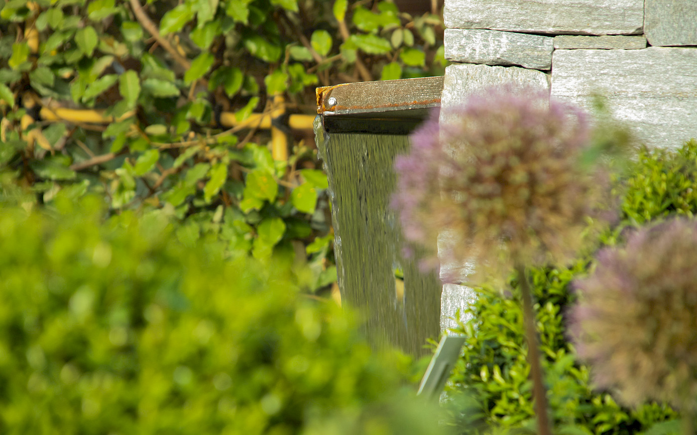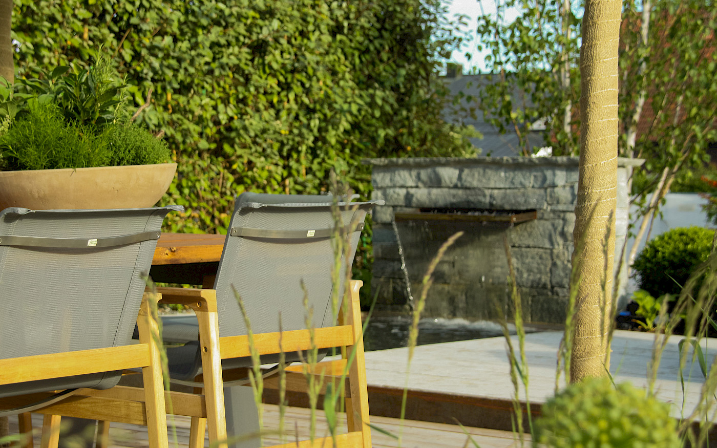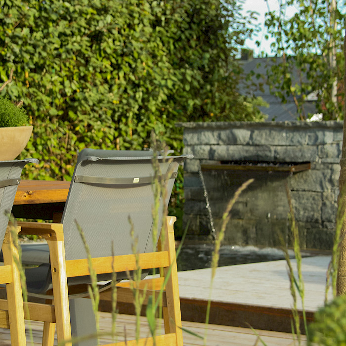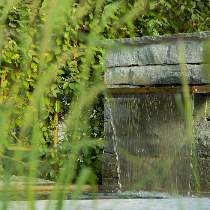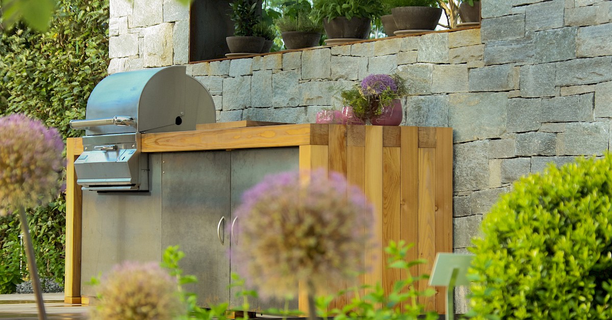 Besonderheiten: Holzterrasse mit Schirmeisenholzbäumen und einer Outdoorküche, Wasserspiel und Natursteinmauern aus Gneis