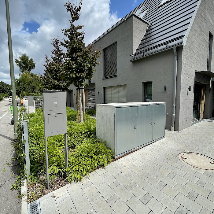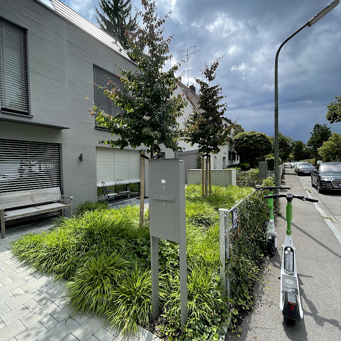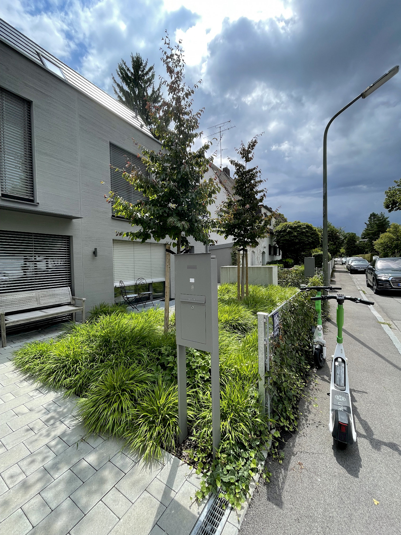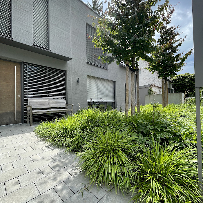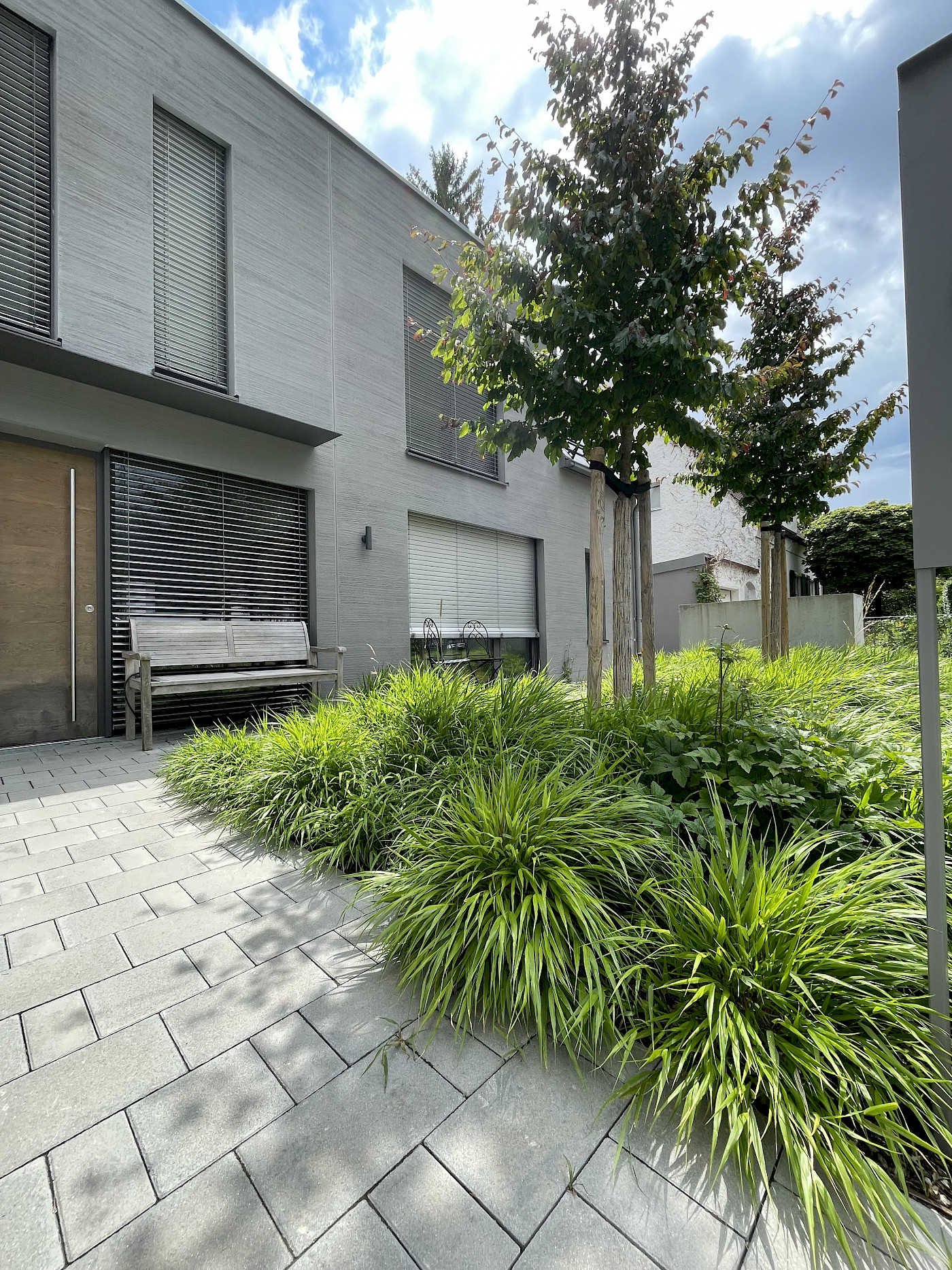 Pflanzflächen sowohl im Vorgarten als auch zwischen den Terrassen sorgen für viel Grün und Privatsphäre. Im Vorgarten schafft eine flächige Bepflanzung mit Hakonechloa macra und drei Eisenholzbäumen eine pflegeleichte und zugleich grüne Gestaltung.