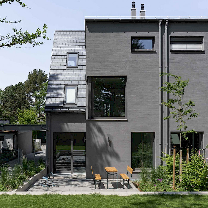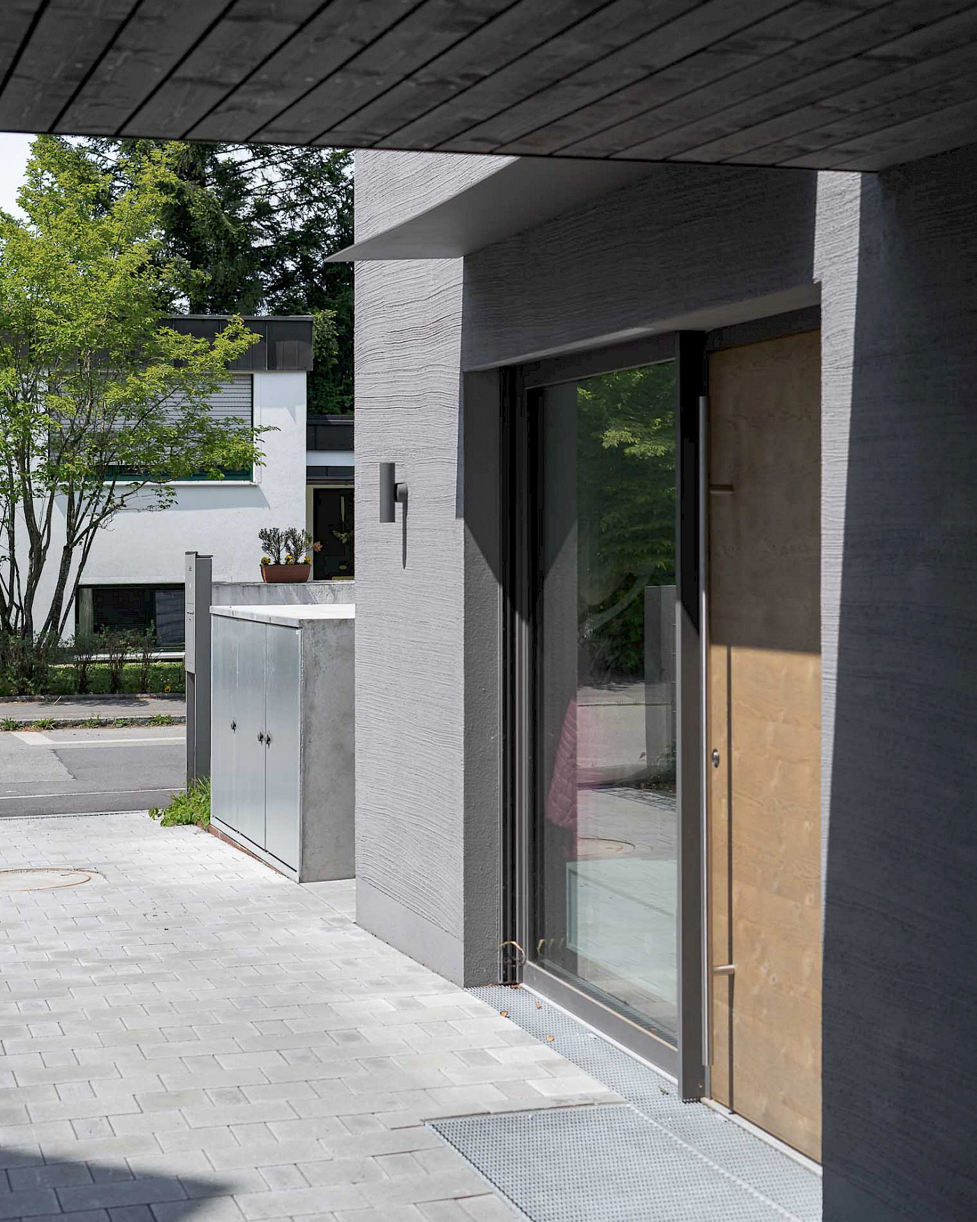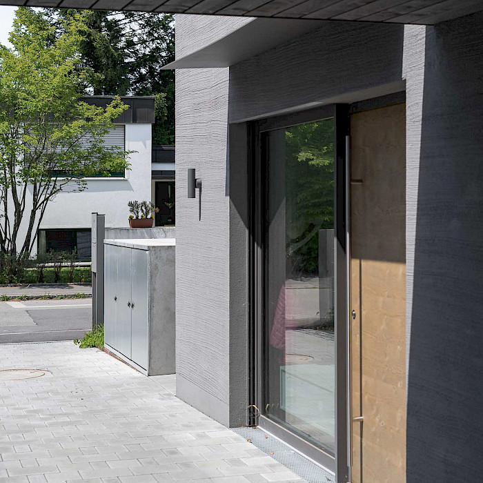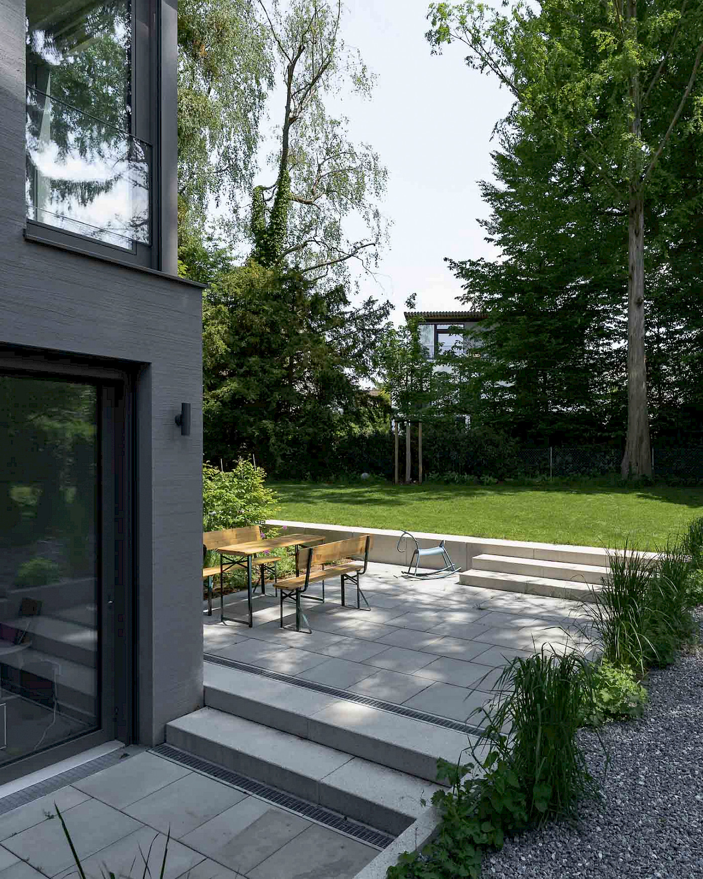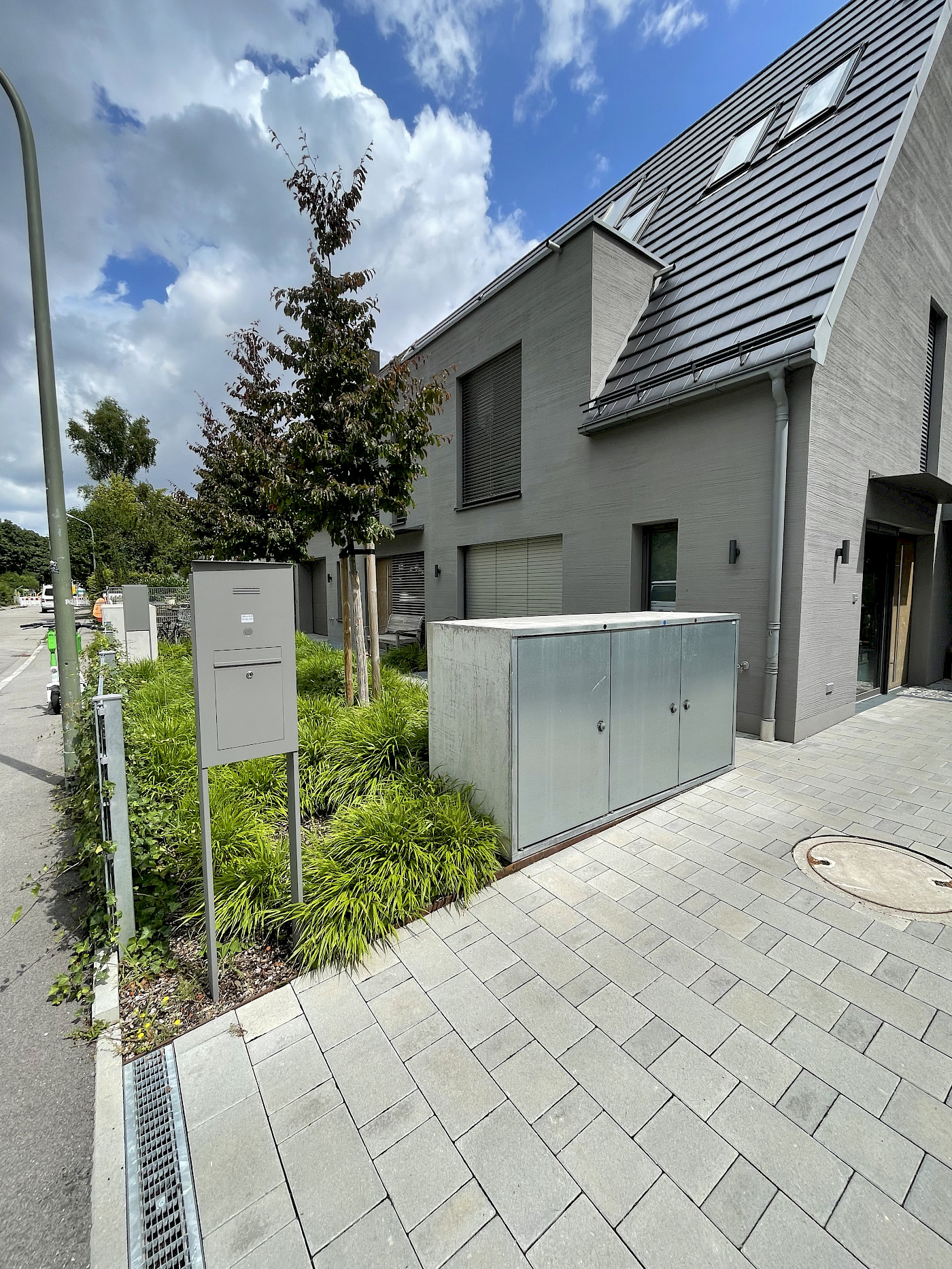 Pflanzflächen sowohl im Vorgarten als auch zwischen den Terrassen sorgen für viel Grün und Privatsphäre. Im Vorgarten schafft eine flächige Bepflanzung mit Hakonechloa macra und drei Eisenholzbäumen eine pflegeleichte und zugleich grüne Gestaltung.