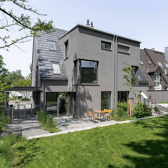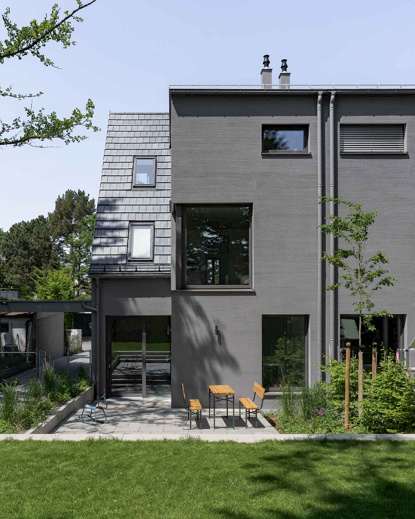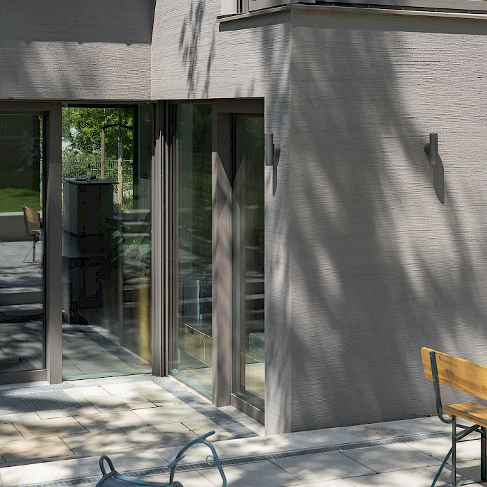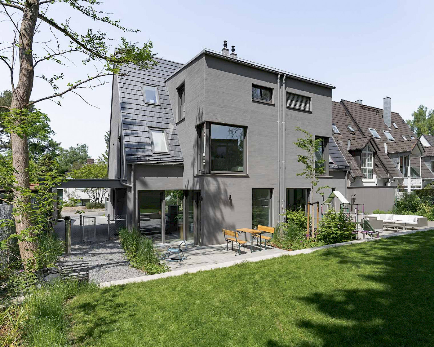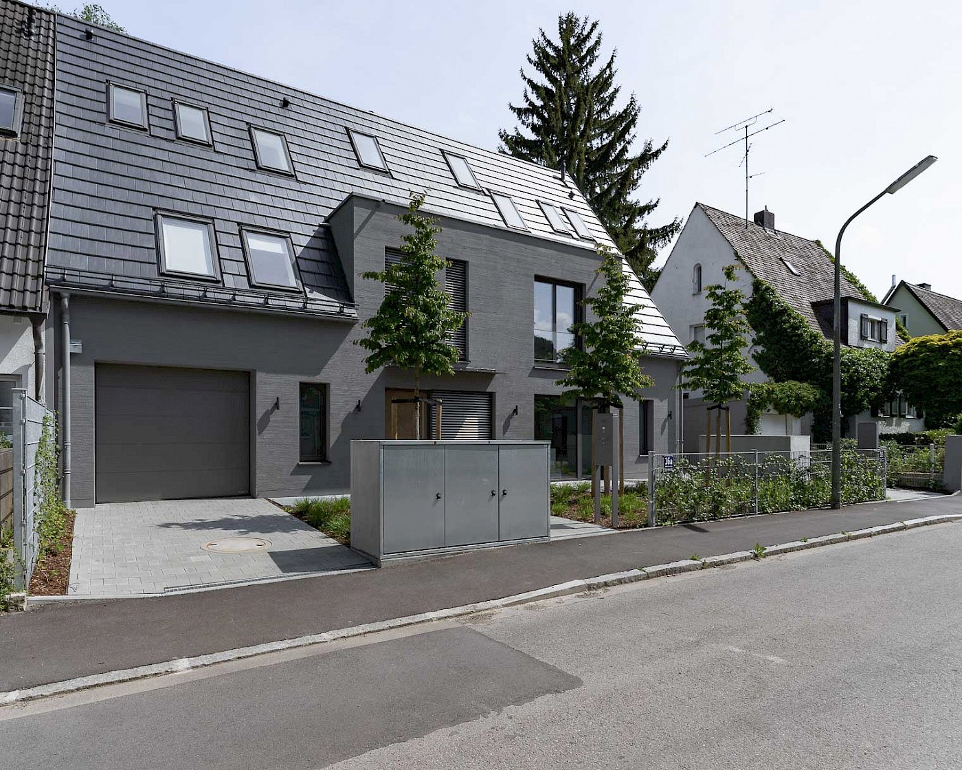 Pflanzflächen sowohl im Vorgarten als auch zwischen den Terrassen sorgen für viel Grün und Privatsphäre. Im Vorgarten schafft eine flächige Bepflanzung mit Hakonechloa macra und drei Eisenholzbäumen eine pflegeleichte und zugleich grüne Gestaltung.