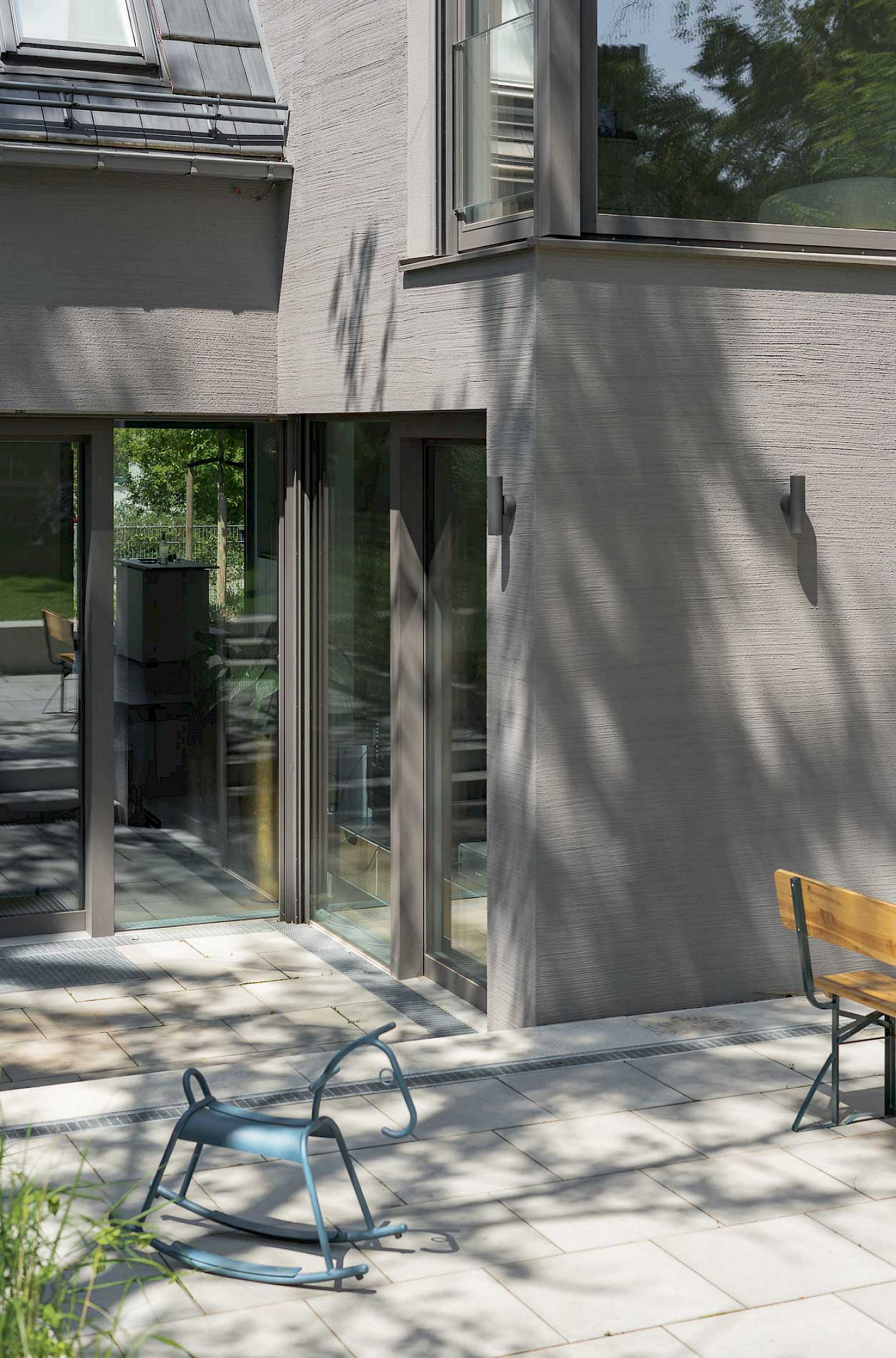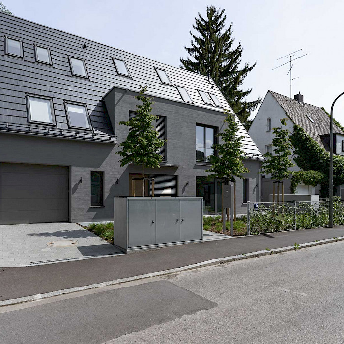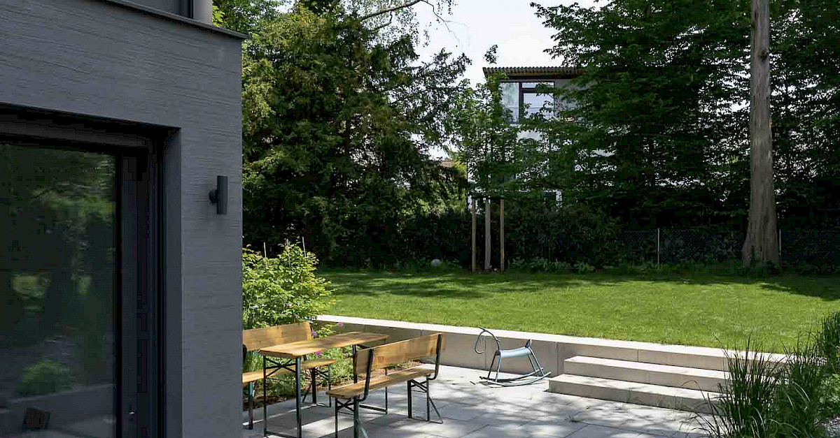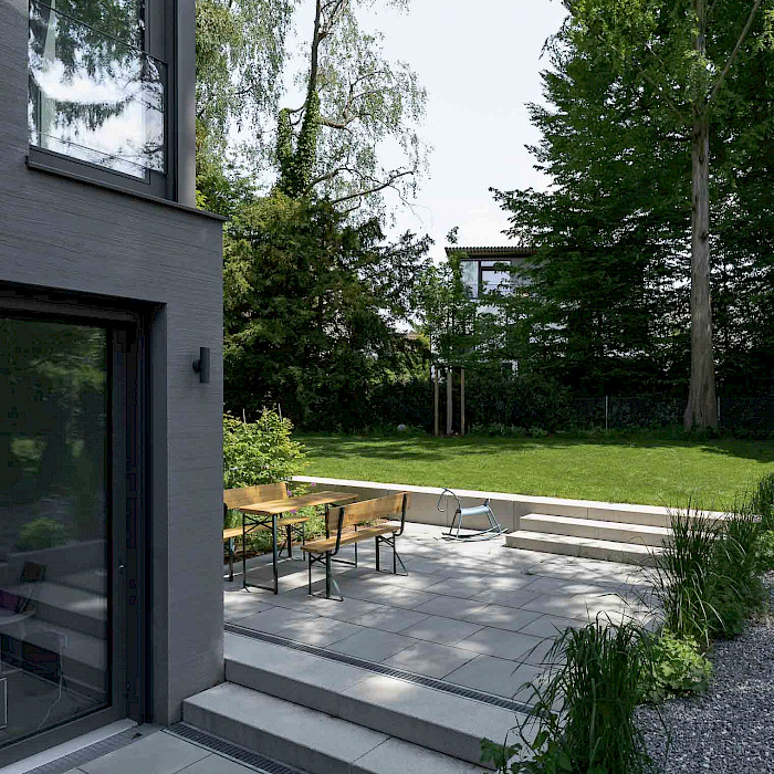 Neuanlage eines modernen Doppelhauses in München. Die klare Aufteilung der Eingangsbereiche und der privaten Terrassenzone sowie ein gemeinschaftlich genutzter Hauptgarten prägen das Projekt. Eine Besonderheit ist die Höhensituation: Der hintere Gartenbereich liegt um gut 75 cm höher als das Wohnzimmerniveau. Dieser Höhenunterschied wurde mittels Stufen und einer durchgehenden Sitzmauer elegant abgefangen.