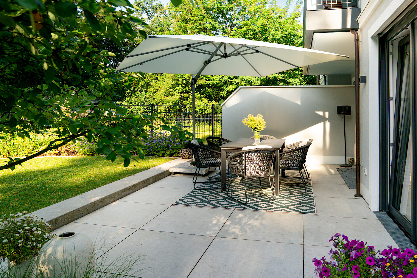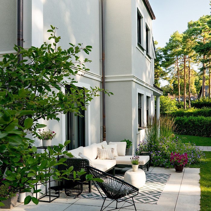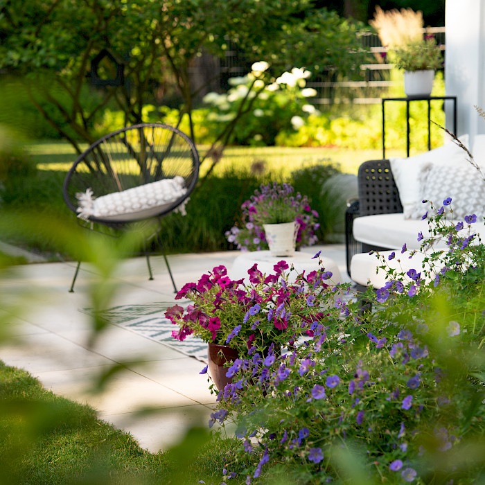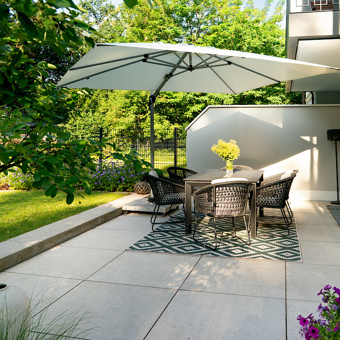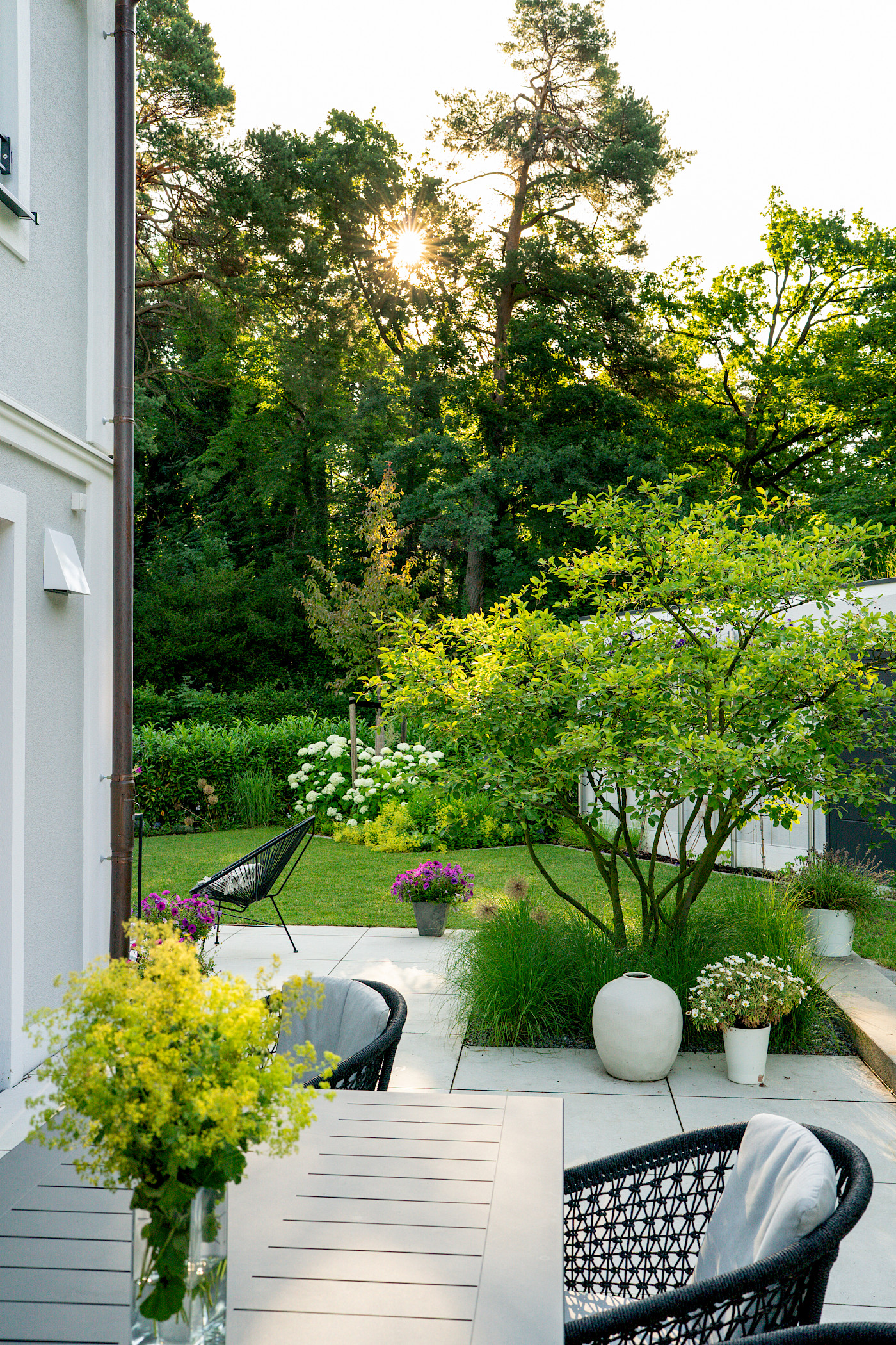 Die Terrasse selbst ist in zwei funktionale Bereiche gegliedert – eine Hauptterrasse mit Essplatz und ein angrenzender Loungebereich. Zwischen beiden Bereichen schafft ein bepflanztes Trennelement mit einer mehrstämmigen Kupfer-Felsenbirne (Amelanchier lamarckii) eine sanfte, aber klare räumliche Abgrenzung. Die lockere Bepflanzung unterstützt die naturnahe Atmosphäre und bildet einen harmonischen Übergang zur umgebenden Landschaft.