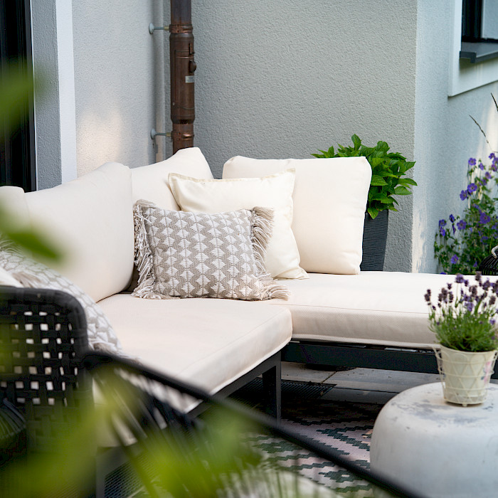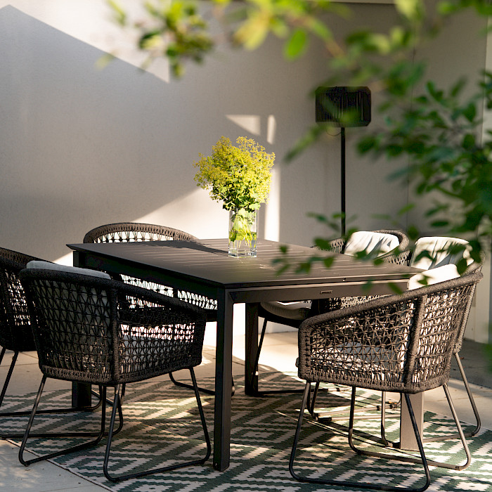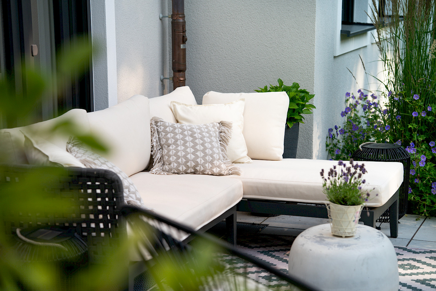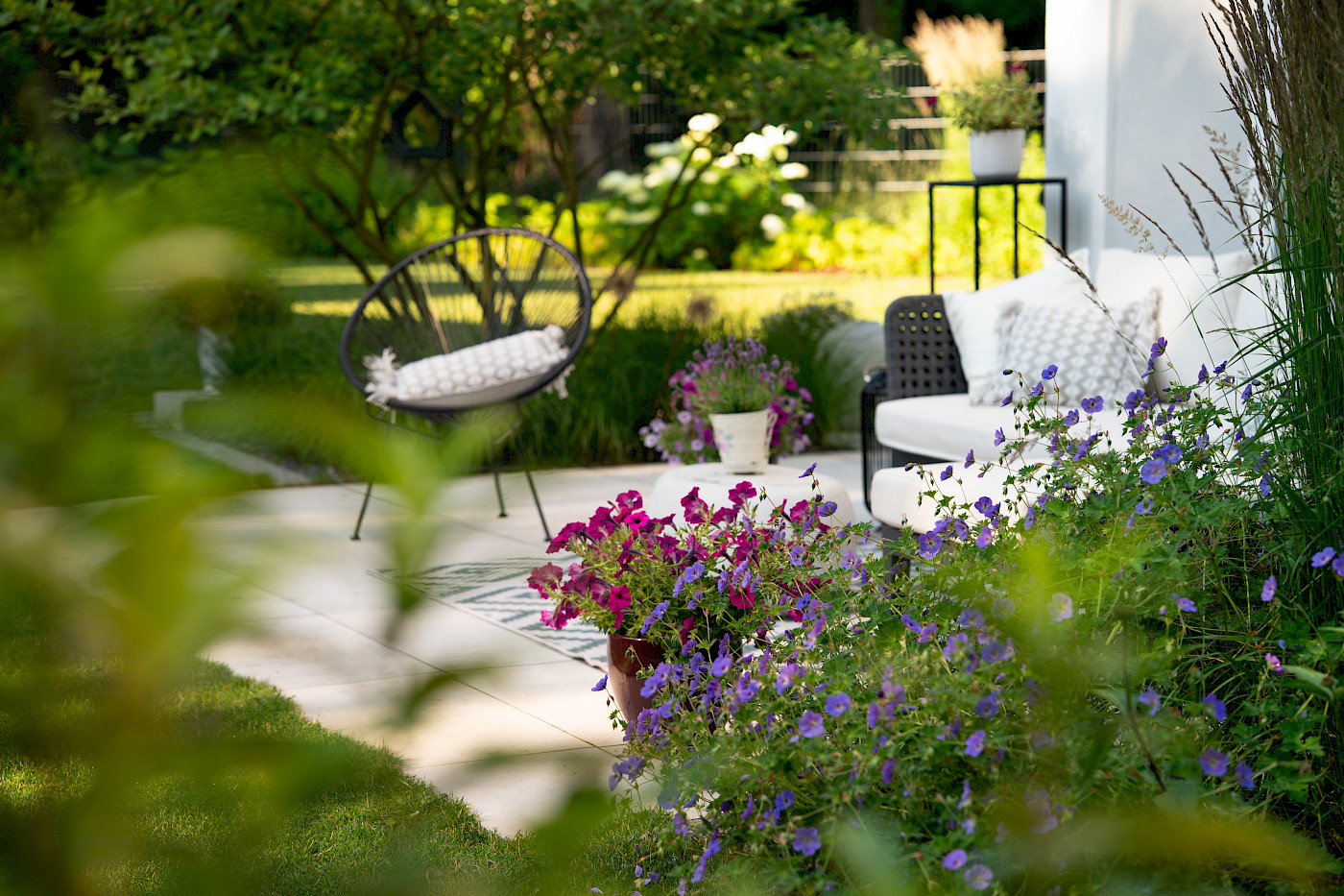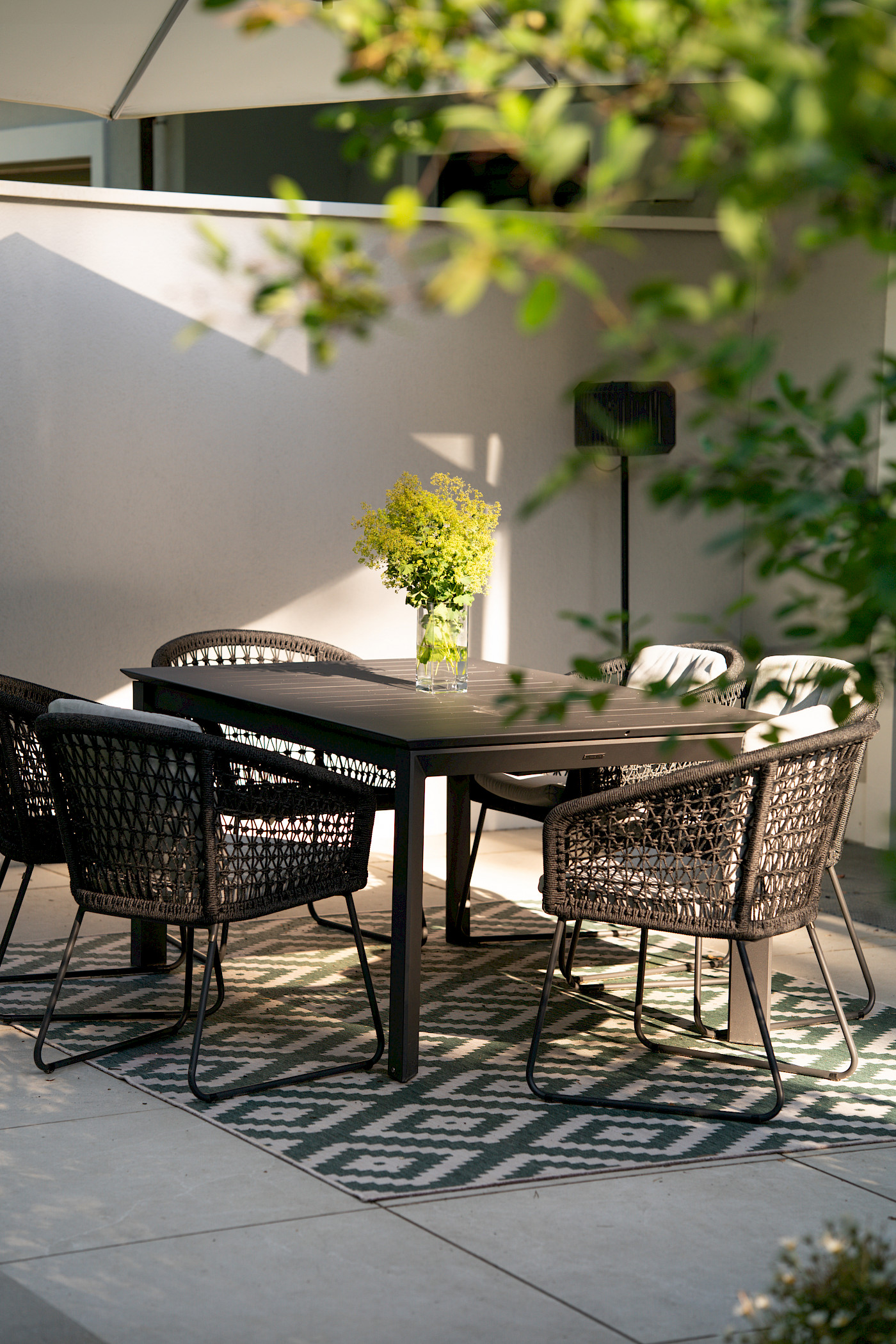 Die Terrasse selbst ist in zwei funktionale Bereiche gegliedert – eine Hauptterrasse mit Essplatz und ein angrenzender Loungebereich. Zwischen beiden Bereichen schafft ein bepflanztes Trennelement mit einer mehrstämmigen Kupfer-Felsenbirne (Amelanchier lamarckii) eine sanfte, aber klare räumliche Abgrenzung. Die lockere Bepflanzung unterstützt die naturnahe Atmosphäre und bildet einen harmonischen Übergang zur umgebenden Landschaft.