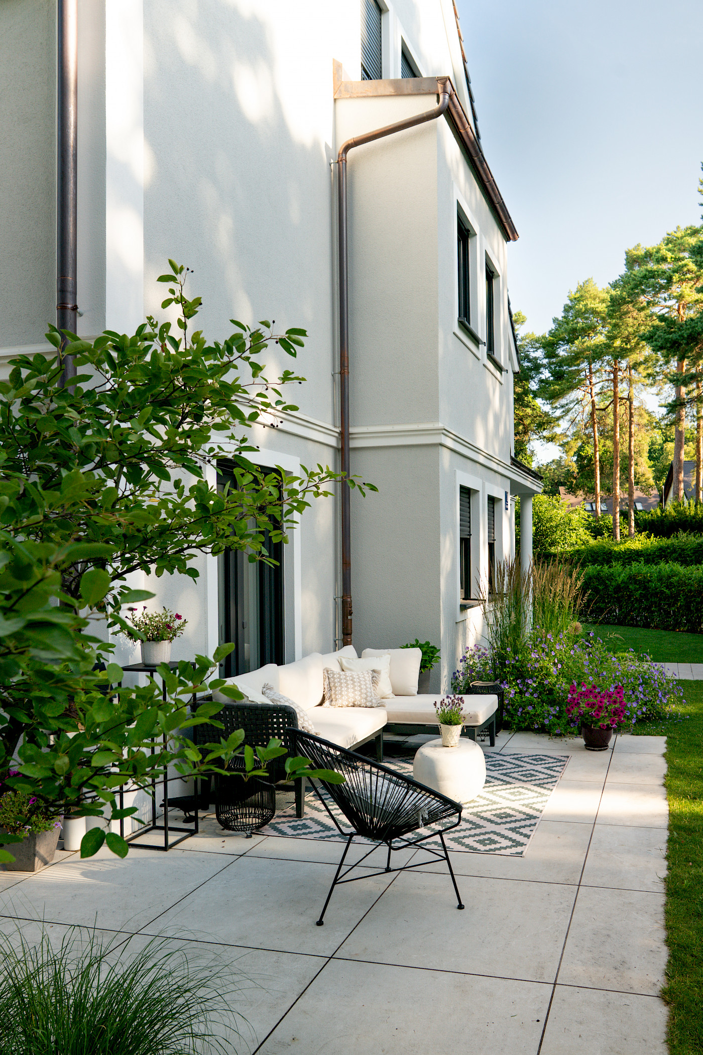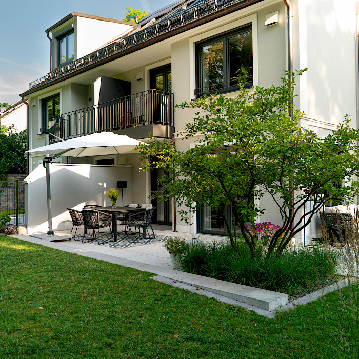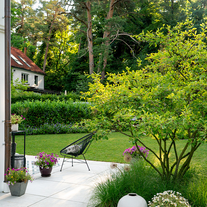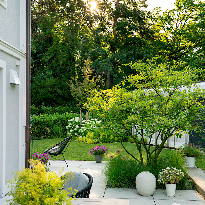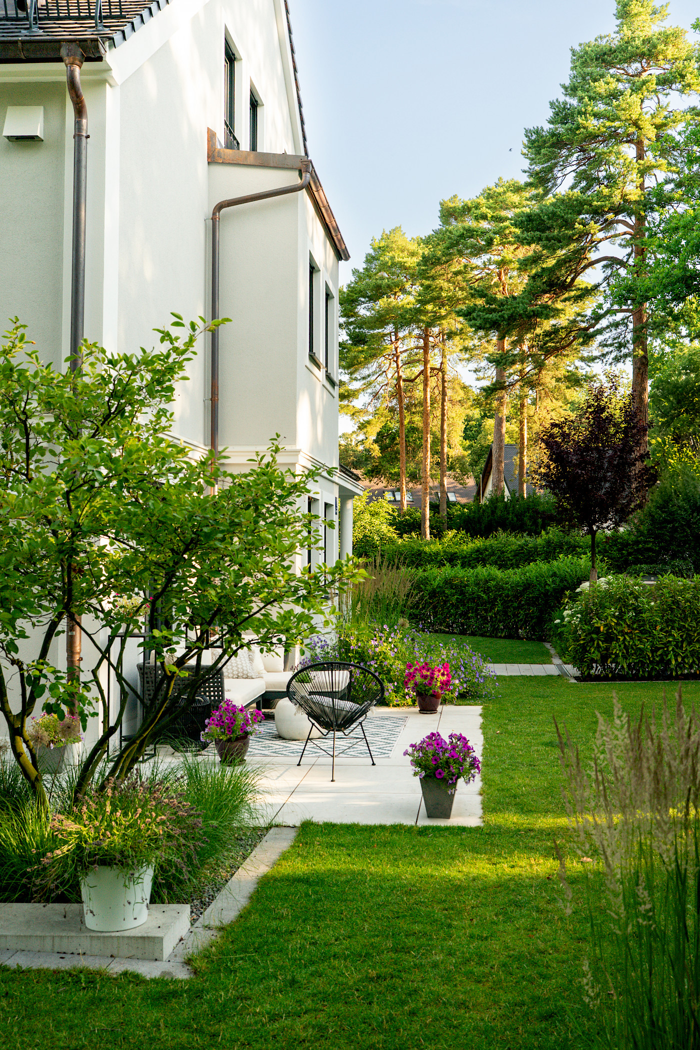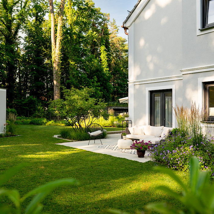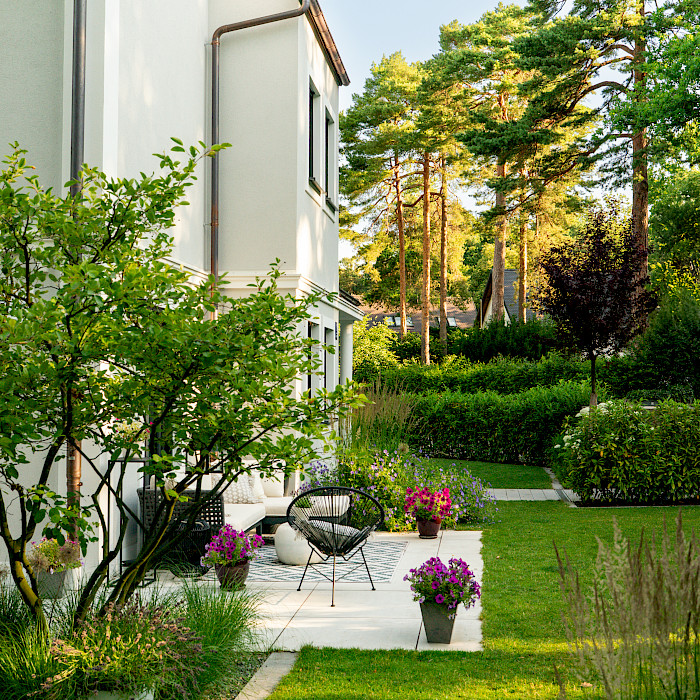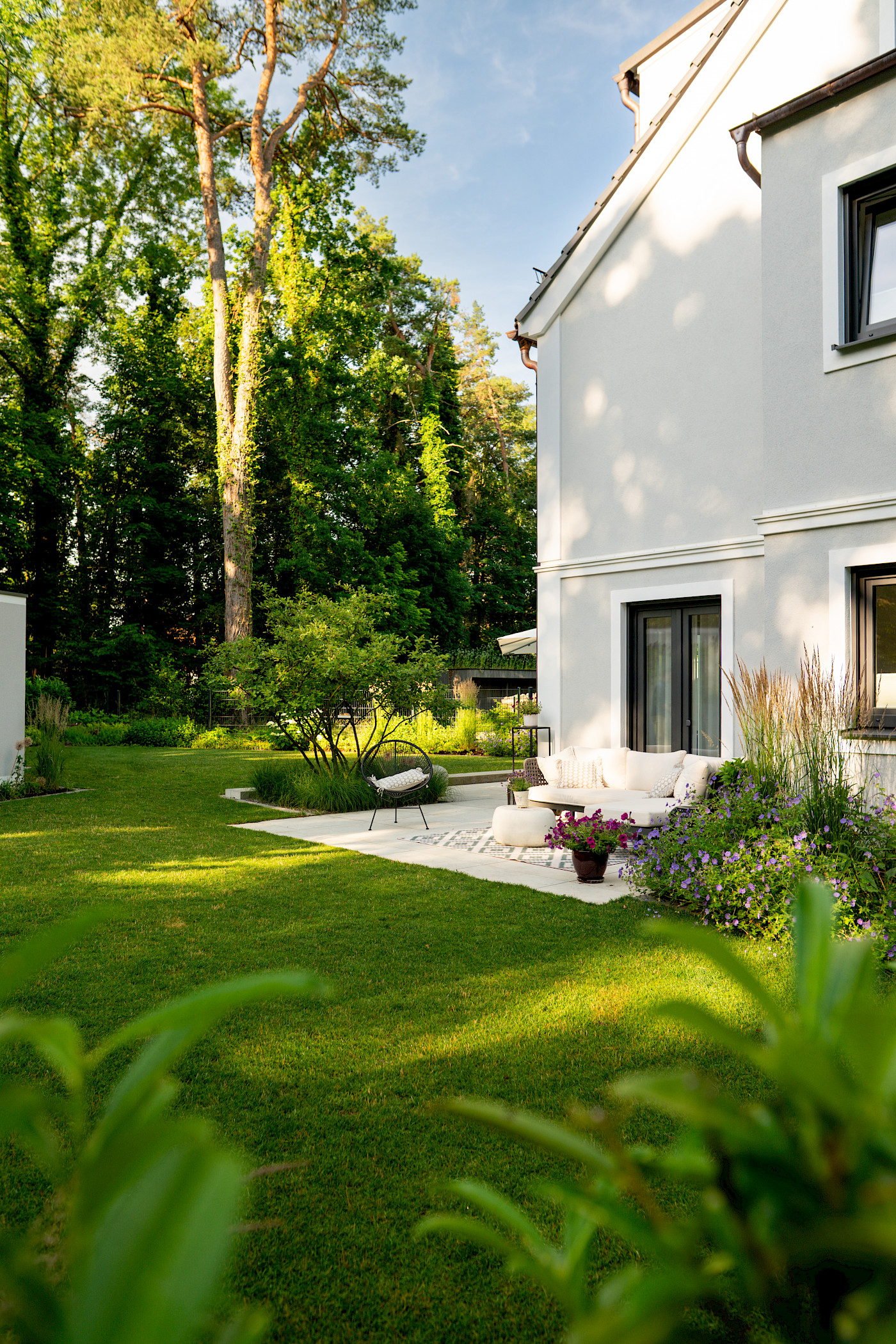 Der Garten dieser Doppelhaushälfte liegt in einem von altem Baumbestand geprägten Wohngebiet und grenzt direkt an einen kleinen Stadtwald – eine besondere Lage, die in der Gestaltung bewusst aufgegriffen wurde. Der natürlich vorhandene Höhenunterschied im Gelände wurde genutzt, um eine spannende räumliche Staffelung zu erzeugen: Der Rasen liegt eine Stufe oberhalb der Hauptterrasse und geht fließend in den bewaldeten Hintergrund über.
