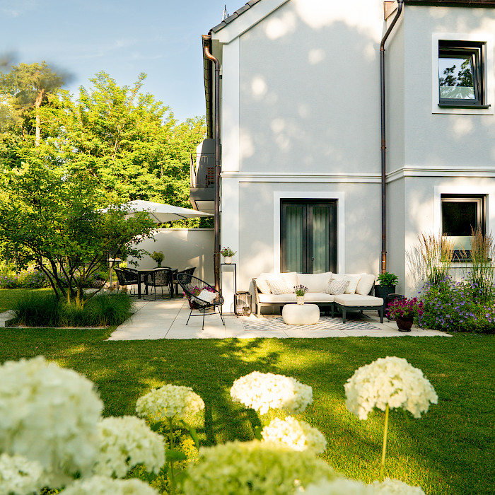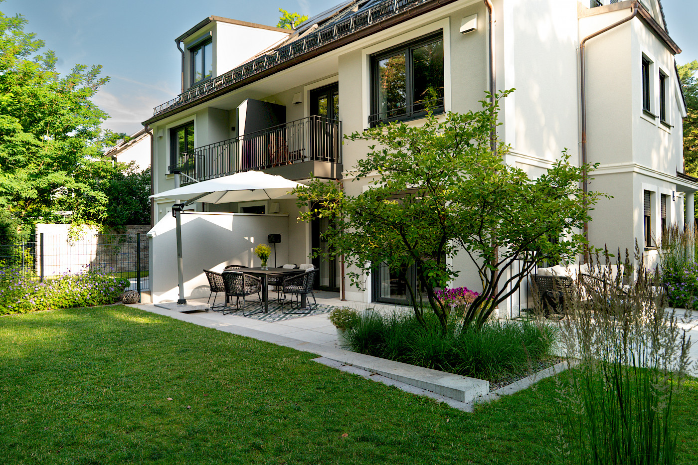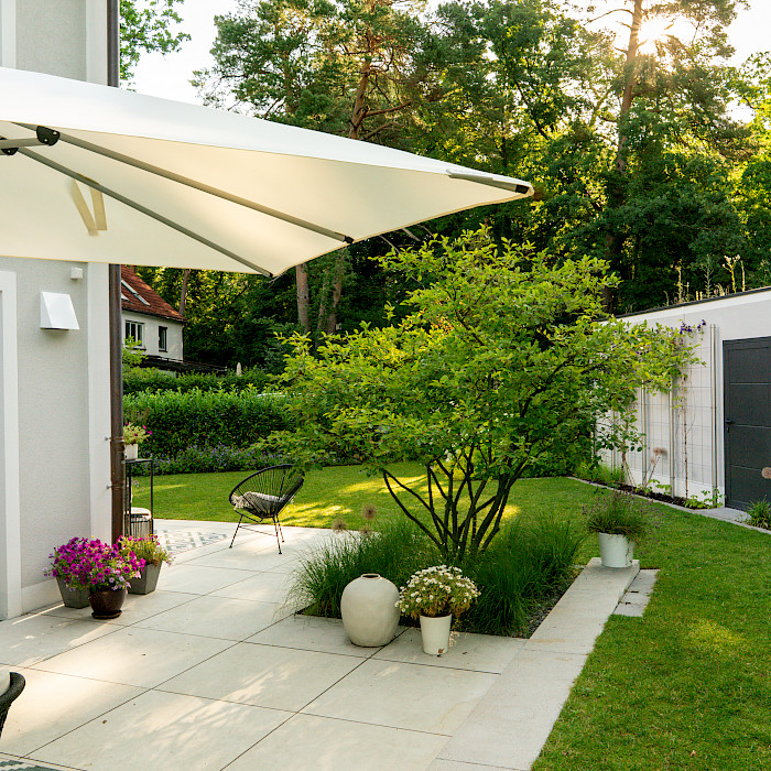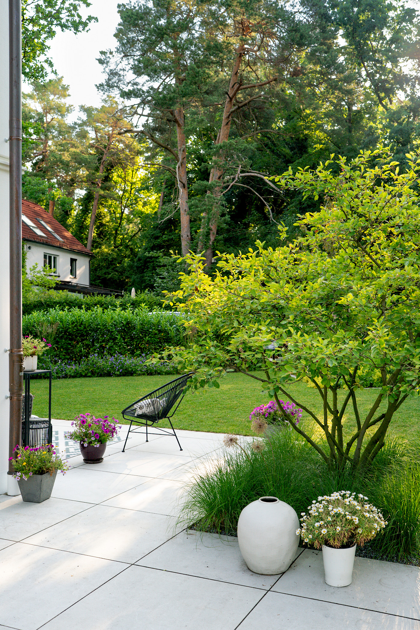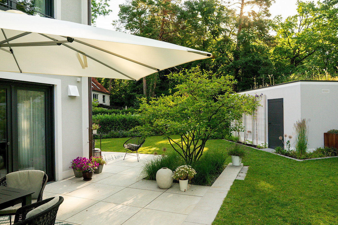 Der Garten dieser Doppelhaushälfte liegt in einem von altem Baumbestand geprägten Wohngebiet und grenzt direkt an einen kleinen Stadtwald – eine besondere Lage, die in der Gestaltung bewusst aufgegriffen wurde. Der natürlich vorhandene Höhenunterschied im Gelände wurde genutzt, um eine spannende räumliche Staffelung zu erzeugen: Der Rasen liegt eine Stufe oberhalb der Hauptterrasse und geht fließend in den bewaldeten Hintergrund über.