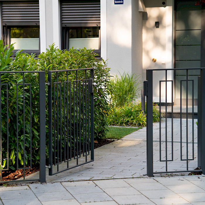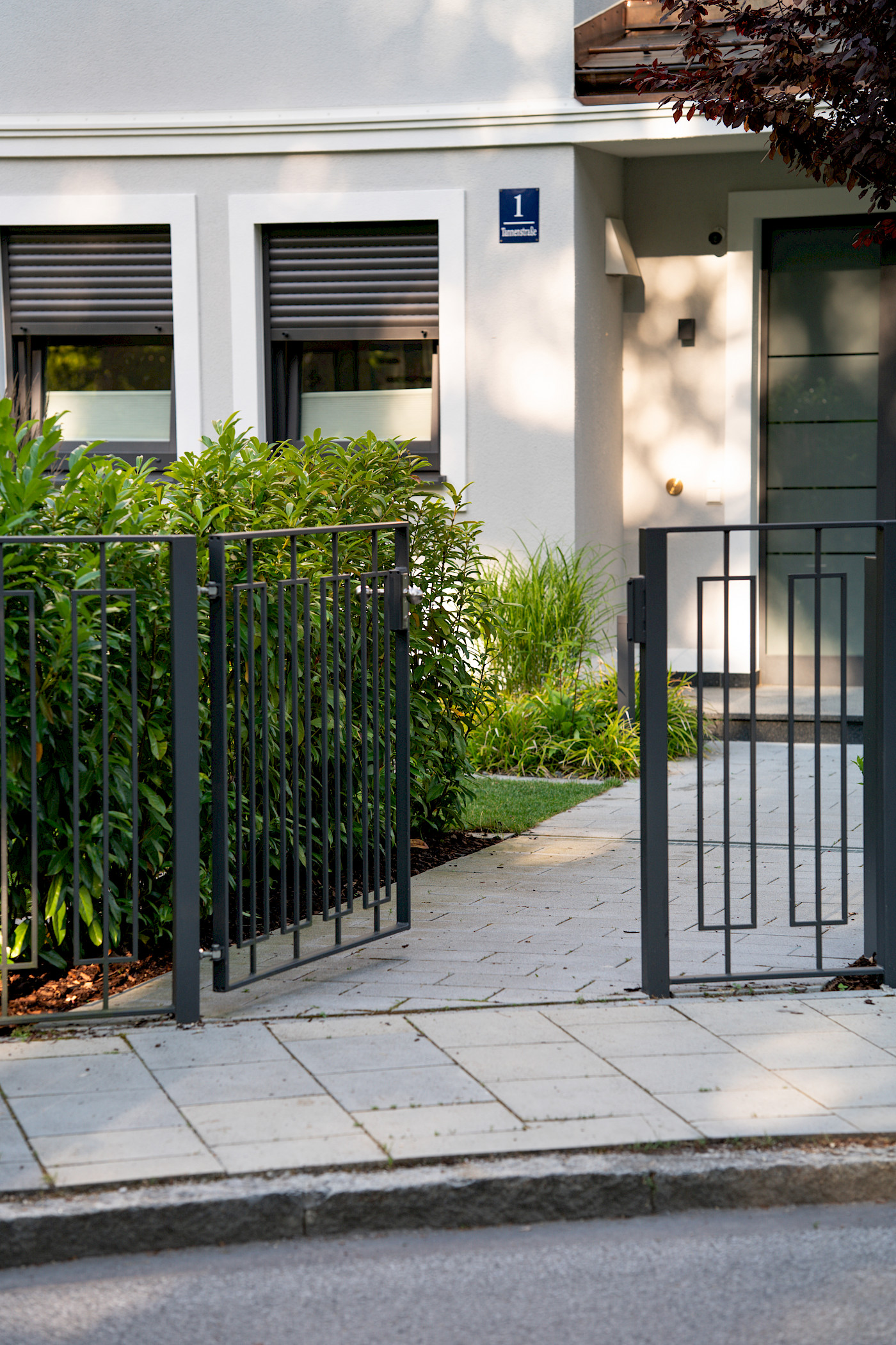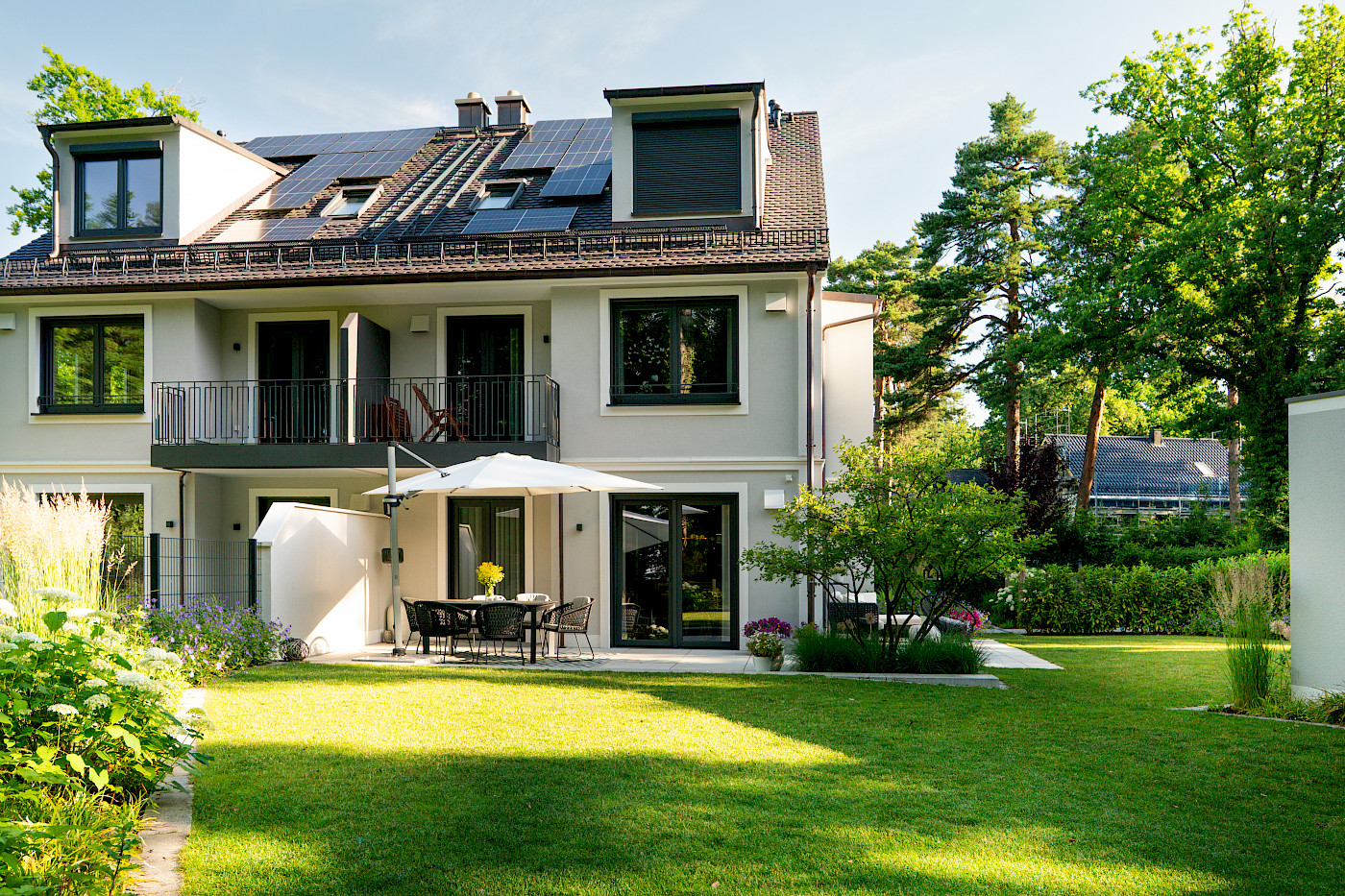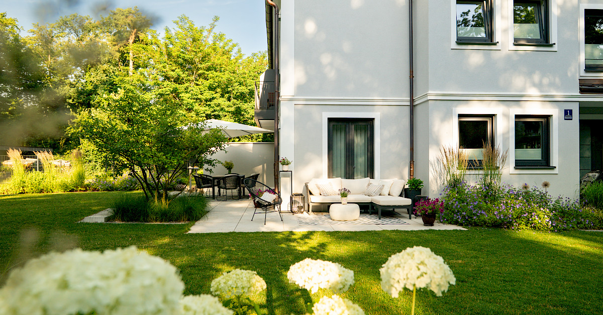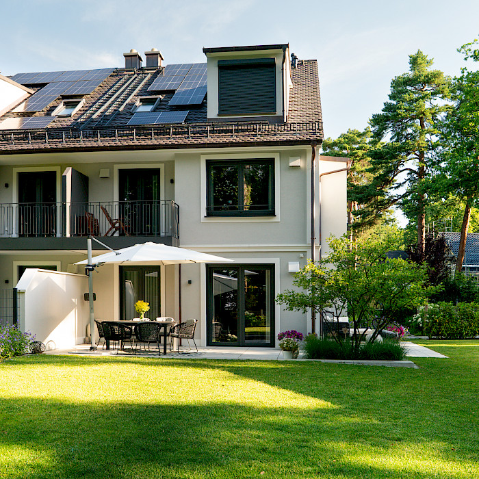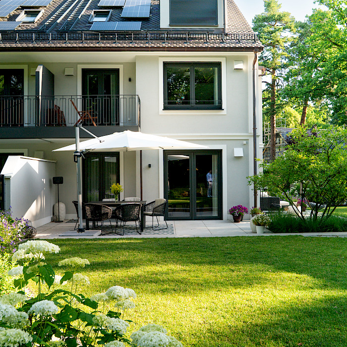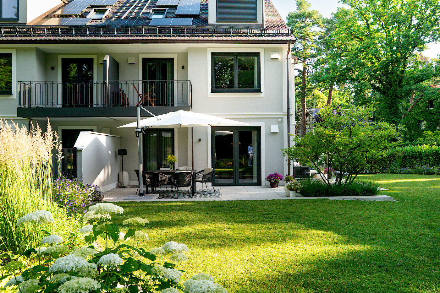 Der Garten dieser Doppelhaushälfte liegt in einem von altem Baumbestand geprägten Wohngebiet und grenzt direkt an einen kleinen Stadtwald – eine besondere Lage, die in der Gestaltung bewusst aufgegriffen wurde. Der natürlich vorhandene Höhenunterschied im Gelände wurde genutzt, um eine spannende räumliche Staffelung zu erzeugen: Der Rasen liegt eine Stufe oberhalb der Hauptterrasse und geht fließend in den bewaldeten Hintergrund über.